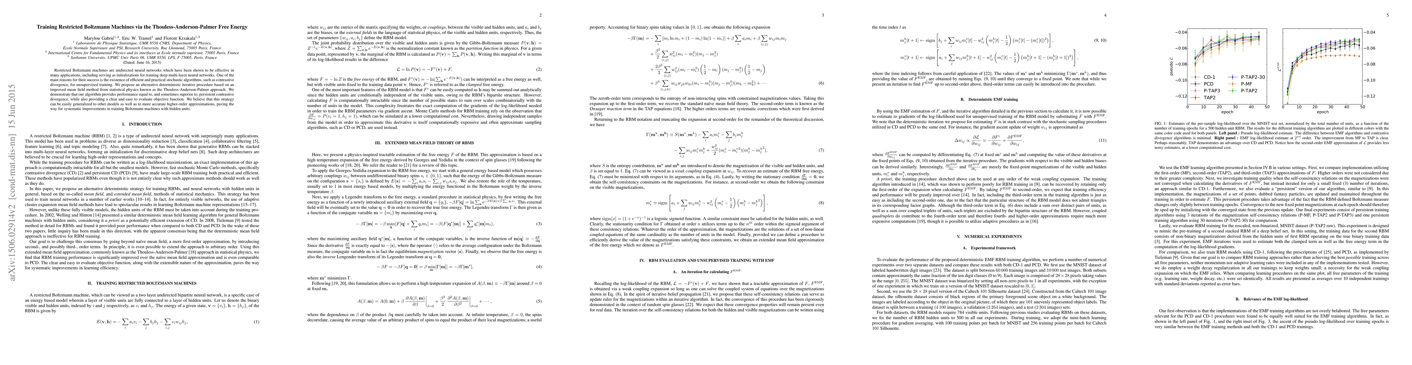 This paper proposes an alternative deterministic training method for Restricted Boltzmann Machines (RBMs) using the Thouless-Anderson-Palmer free energy approach, demonstrating comparable or superior performance to existing stochastic methods, and offering a clear objective function. The authors suggest this method can be extended to other neural network models and higher-order approximations.