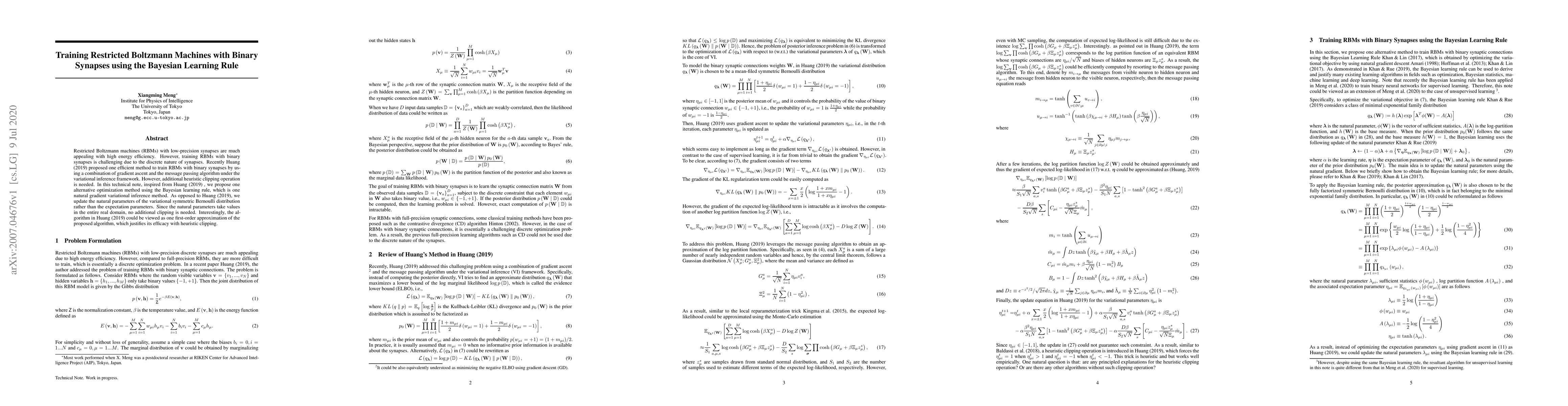 This paper proposes an alternative method to train Restricted Boltzmann Machines (RBMs) with binary synapses using the Bayesian learning rule, which updates natural parameters instead of expectation parameters, eliminating the need for heuristic clipping. This approach is shown to be a natural gradient variational inference method, providing a more efficient training process compared to existing methods.