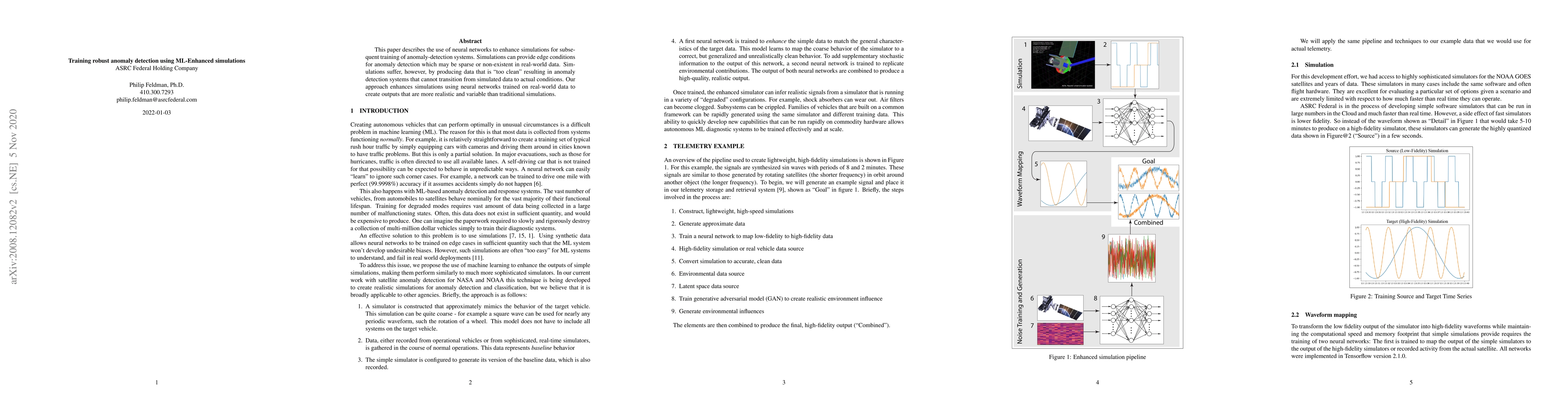 This paper proposes using neural networks to enhance simulations for training robust anomaly detection systems, addressing the issue of "too clean" simulated data by incorporating real-world data to create more realistic and variable outputs.