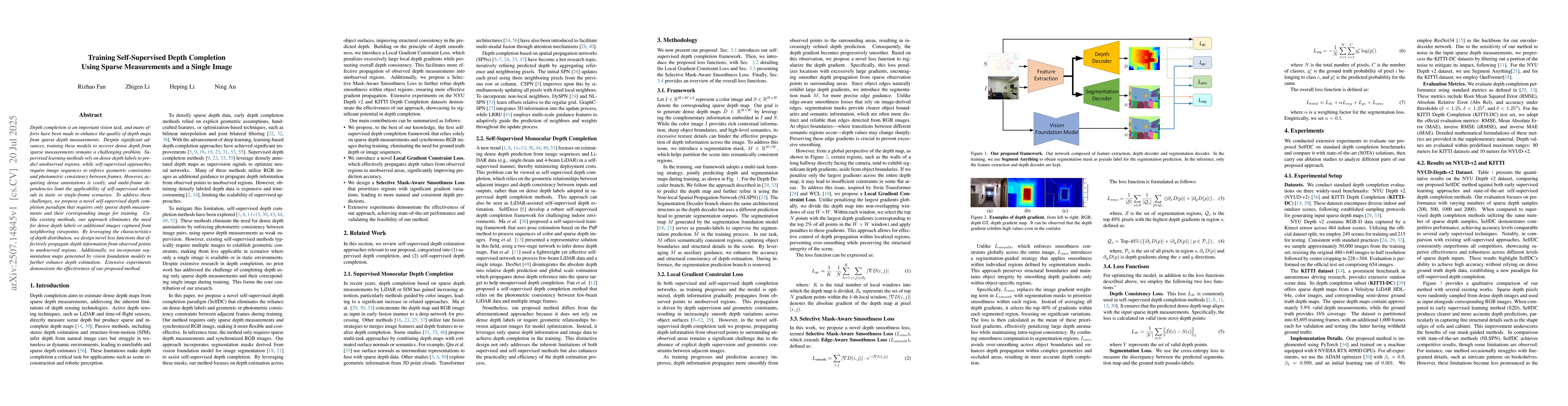 Depth completion is an important vision task, and many efforts have been made to enhance the quality of depth maps from sparse depth measurements. Despite significant advances, training these models to recover dense depth from sparse measurements remains a challenging problem. Supervised learning methods rely on dense depth labels to predict unobserved regions, while self-supervised approaches require image sequences to enforce geometric constraints and photometric consistency between frames. However, acquiring dense annotations is costly, and multi-frame dependencies limit the applicability of self-supervised methods in static or single-frame scenarios. To address these challenges, we propose a novel self-supervised depth completion paradigm that requires only sparse depth measurements and their corresponding image for training. Unlike existing methods, our approach eliminates the need for dense depth labels or additional images captured from neighboring viewpoints. By leveraging the characteristics of depth distribution, we design novel loss functions that effectively propagate depth information from observed points to unobserved regions. Additionally, we incorporate segmentation maps generated by vision foundation models to further enhance depth estimation. Extensive experiments demonstrate the effectiveness of our proposed method.