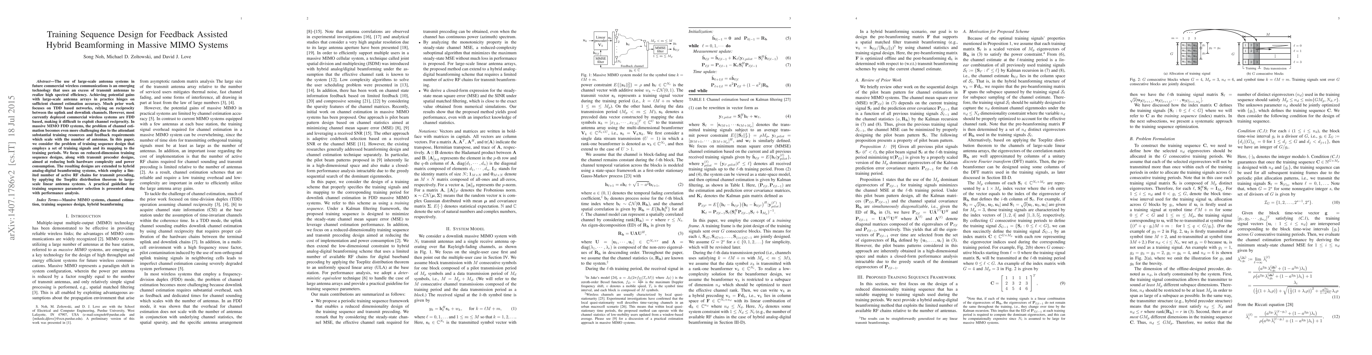 This paper addresses the design of efficient training sequences for channel estimation in massive MIMO FDD systems, focusing on reducing hardware complexity and power consumption while employing hybrid analog-digital beamforming. It proposes reduced-dimension training designs and provides a practical guideline for parameter selection with performance analysis.