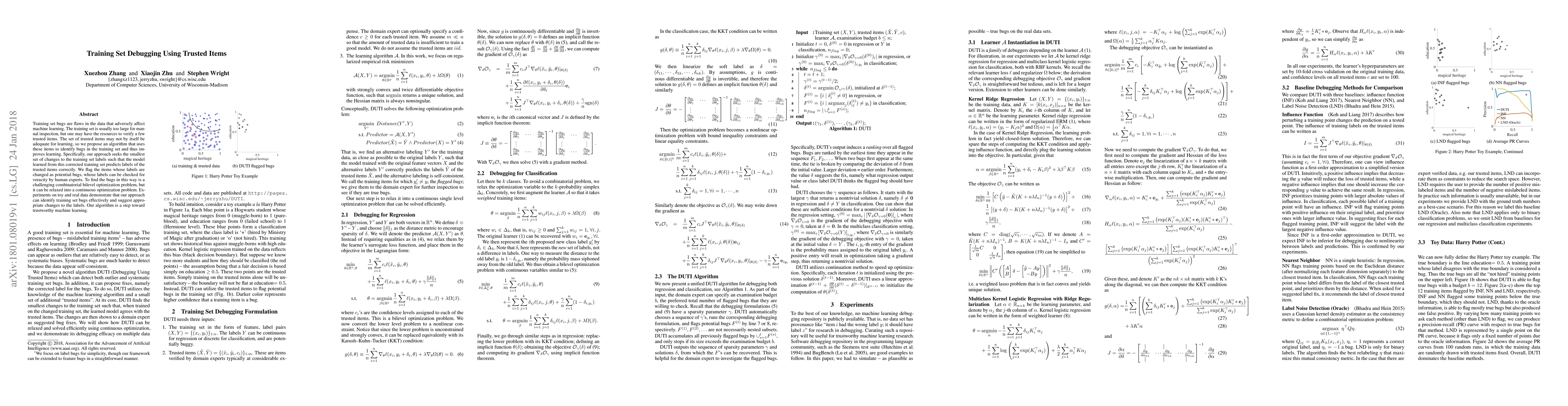 Training set bugs are flaws in the data that adversely affect machine learning. The training set is usually too large for man- ual inspection, but one may have the resources to verify a few trusted items. The set of trusted items may not by itself be adequate for learning, so we propose an algorithm that uses these items to identify bugs in the training set and thus im- proves learning. Specifically, our approach seeks the smallest set of changes to the training set labels such that the model learned from this corrected training set predicts labels of the trusted items correctly. We flag the items whose labels are changed as potential bugs, whose labels can be checked for veracity by human experts. To find the bugs in this way is a challenging combinatorial bilevel optimization problem, but it can be relaxed into a continuous optimization problem. Ex- periments on toy and real data demonstrate that our approach can identify training set bugs effectively and suggest appro- priate changes to the labels. Our algorithm is a step toward trustworthy machine learning.