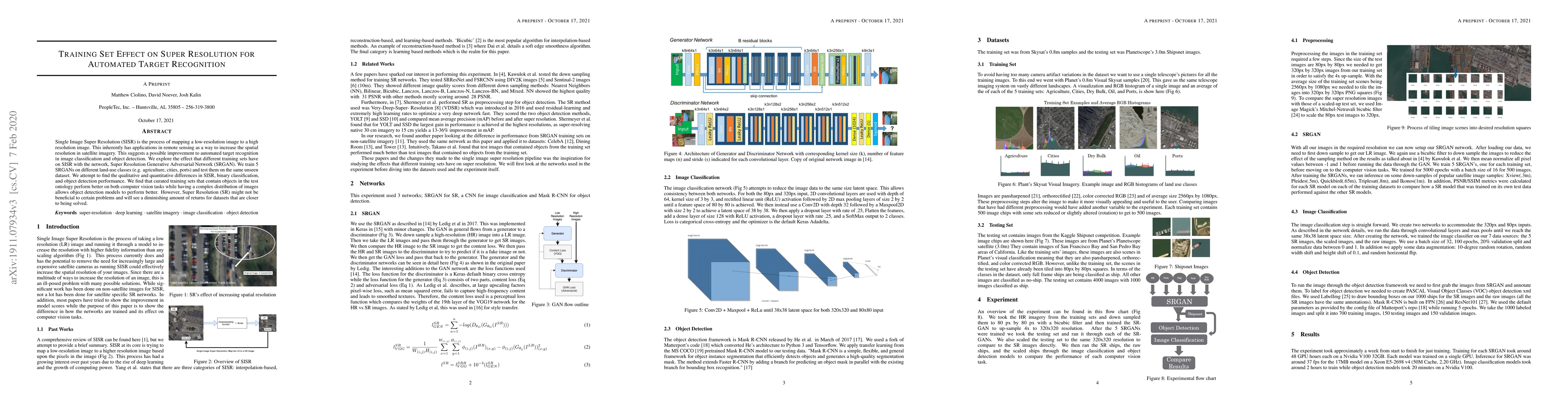 Single Image Super Resolution (SISR) is the process of mapping a low-resolution image to a high resolution image. This inherently has applications in remote sensing as a way to increase the spatial resolution in satellite imagery. This suggests a possible improvement to automated target recognition in image classification and object detection. We explore the effect that different training sets have on SISR with the network, Super Resolution Generative Adversarial Network (SRGAN). We train 5 SRGANs on different land-use classes (e.g. agriculture, cities, ports) and test them on the same unseen dataset. We attempt to find the qualitative and quantitative differences in SISR, binary classification, and object detection performance. We find that curated training sets that contain objects in the test ontology perform better on both computer vision tasks while having a complex distribution of images allows object detection models to perform better. However, Super Resolution (SR) might not be beneficial to certain problems and will see a diminishing amount of returns for datasets that are closer to being solved.