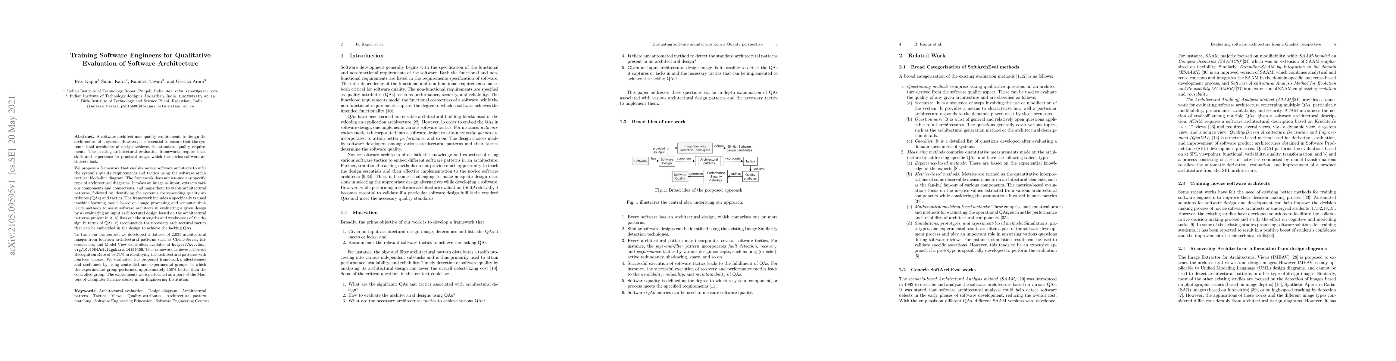 A new framework helps novice software architects evaluate system quality by analyzing architectural block-line diagrams, identifying quality attributes, and recommending tactics to improve design, with a 98.71% recognition rate for architectural patterns.