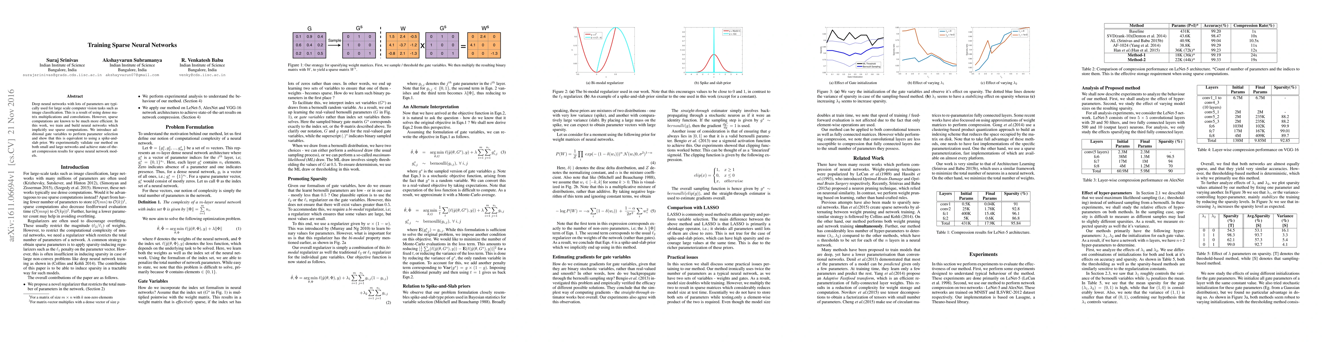Deep neural networks with lots of parameters are typically used for large-scale computer vision tasks such as image classification. This is a result of using dense matrix multiplications and convolutions. However, sparse computations are known to be much more efficient. In this work, we train and build neural networks which implicitly use sparse computations. We introduce additional gate variables to perform parameter selection and show that this is equivalent to using a spike-and-slab prior. We experimentally validate our method on both small and large networks and achieve state-of-the-art compression results for sparse neural network models.