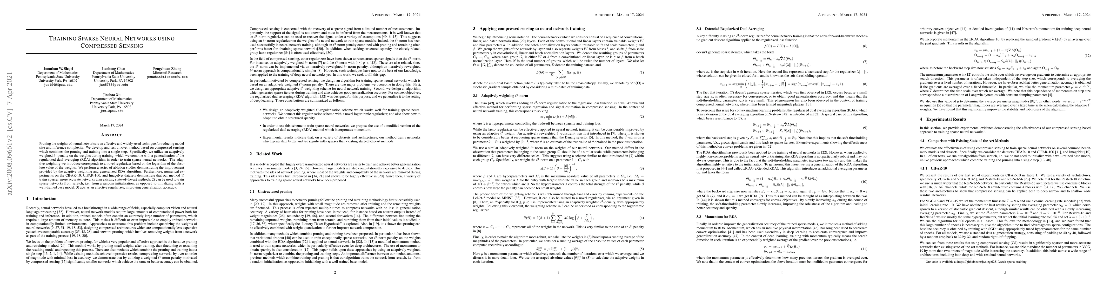 This paper proposes a novel method for training sparse neural networks using compressed sensing, combining pruning and training into a single step through an adaptively weighted $\ell^1$ penalty and a generalized RDA algorithm. Experiments show improved accuracy and generalization, and the method can train sparse networks from scratch.