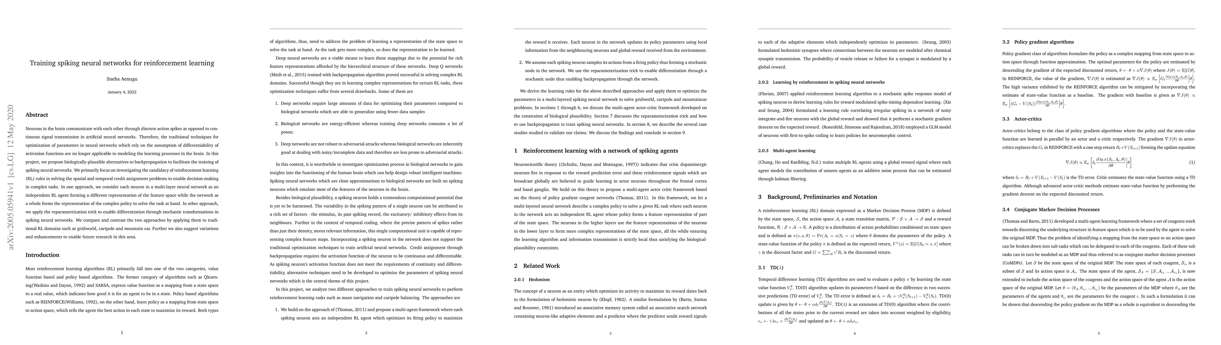 This paper proposes biologically-plausible alternatives to backpropagation for training spiking neural networks, focusing on reinforcement learning (RL) to address the spatial and temporal credit assignment problems. The study compares two RL-based approaches: treating neurons as independent RL agents and using reparameterization tricks, and applies them to standard RL tasks.