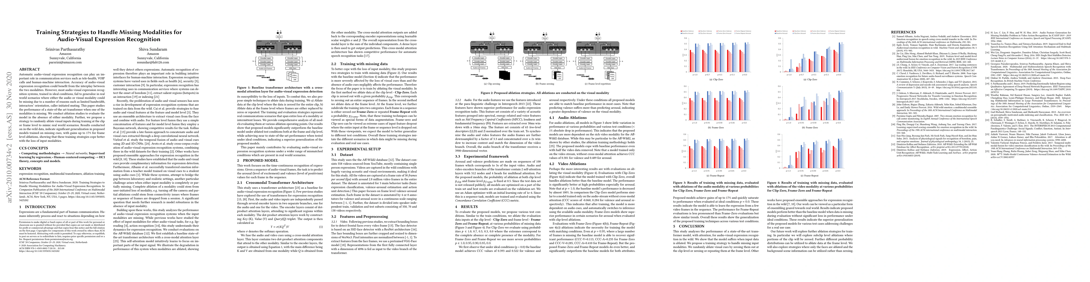 Automatic audio-visual expression recognition can play an important role in communication services such as tele-health, VOIP calls and human-machine interaction. Accuracy of audio-visual expression recognition could benefit from the interplay between the two modalities. However, most audio-visual expression recognition systems, trained in ideal conditions, fail to generalize in real world scenarios where either the audio or visual modality could be missing due to a number of reasons such as limited bandwidth, interactors' orientation, caller initiated muting. This paper studies the performance of a state-of-the art transformer when one of the modalities is missing. We conduct ablation studies to evaluate the model in the absence of either modality. Further, we propose a strategy to randomly ablate visual inputs during training at the clip or frame level to mimic real world scenarios. Results conducted on in-the-wild data, indicate significant generalization in proposed models trained on missing cues, with gains up to 17% for frame level ablations, showing that these training strategies cope better with the loss of input modalities.