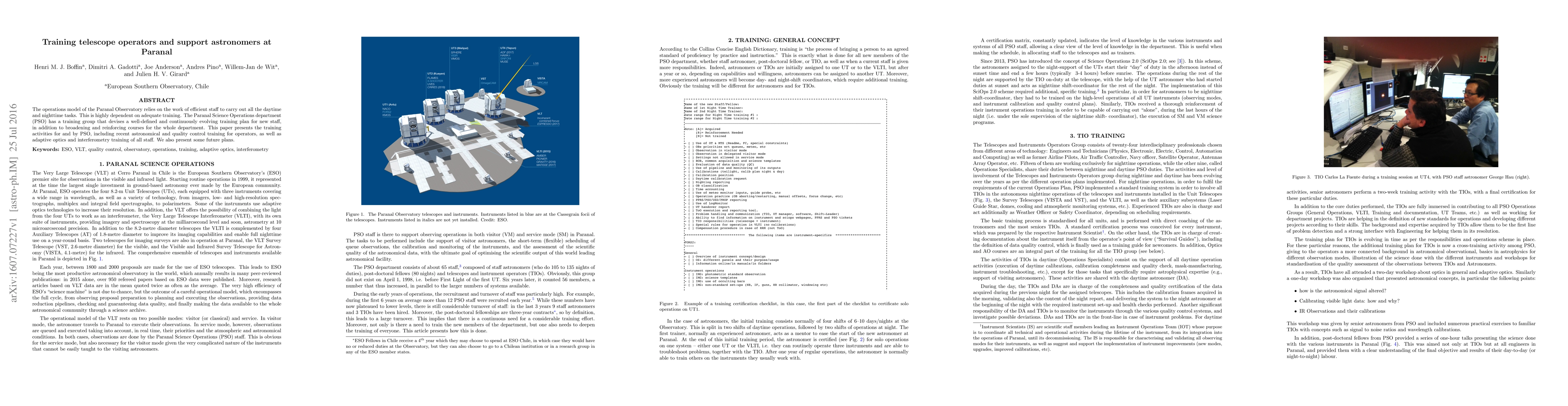 The Paranal Science Operations department trains telescope operators and support astronomers through a well-defined and evolving training plan, focusing on recent astronomical and quality control courses, as well as advanced training in adaptive optics and interferometry, with future plans also outlined.