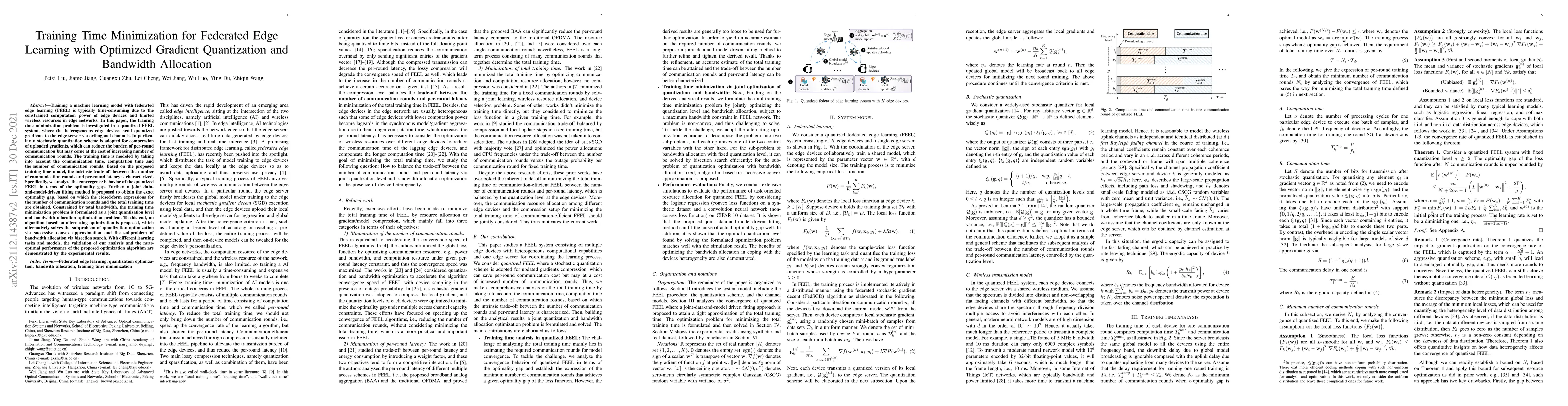 This paper investigates training time minimization in federated edge learning (FEEL) by optimizing gradient quantization and bandwidth allocation. It proposes a stochastic quantization scheme and formulates the training time minimization problem as a joint optimization problem, solved using an alternating optimization algorithm, demonstrating near-optimal performance through experiments.