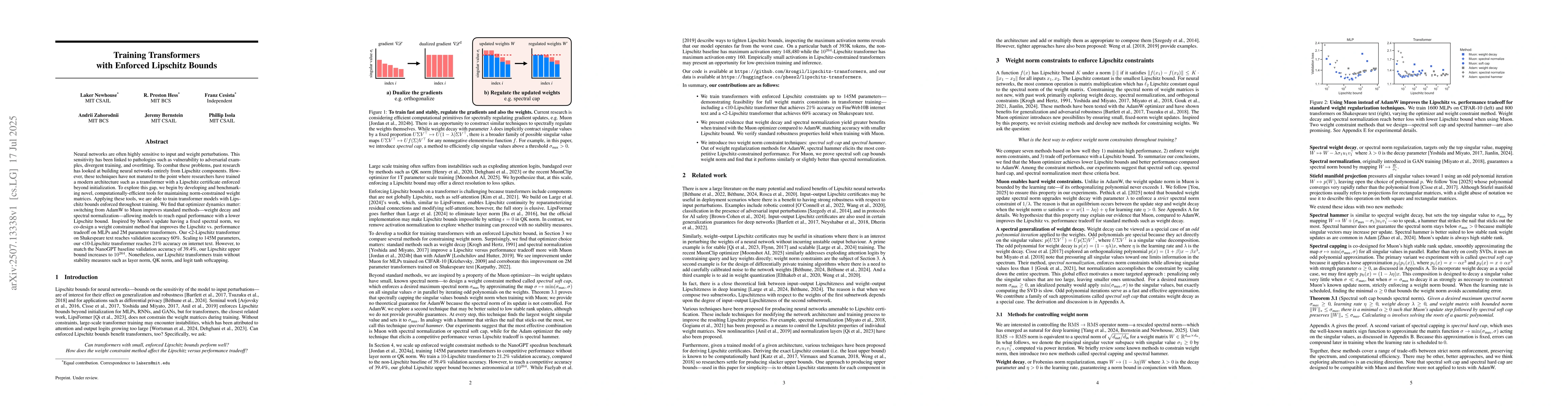 Neural networks are often highly sensitive to input and weight perturbations. This sensitivity has been linked to pathologies such as vulnerability to adversarial examples, divergent training, and overfitting. To combat these problems, past research has looked at building neural networks entirely from Lipschitz components. However, these techniques have not matured to the point where researchers have trained a modern architecture such as a transformer with a Lipschitz certificate enforced beyond initialization. To explore this gap, we begin by developing and benchmarking novel, computationally-efficient tools for maintaining norm-constrained weight matrices. Applying these tools, we are able to train transformer models with Lipschitz bounds enforced throughout training. We find that optimizer dynamics matter: switching from AdamW to Muon improves standard methods -- weight decay and spectral normalization -- allowing models to reach equal performance with a lower Lipschitz bound. Inspired by Muon's update having a fixed spectral norm, we co-design a weight constraint method that improves the Lipschitz vs. performance tradeoff on MLPs and 2M parameter transformers. Our 2-Lipschitz transformer on Shakespeare text reaches validation accuracy 60%. Scaling to 145M parameters, our 10-Lipschitz transformer reaches 21% accuracy on internet text. However, to match the NanoGPT baseline validation accuracy of 39.4%, our Lipschitz upper bound increases to 10^264. Nonetheless, our Lipschitz transformers train without stability measures such as layer norm, QK norm, and logit tanh softcapping.