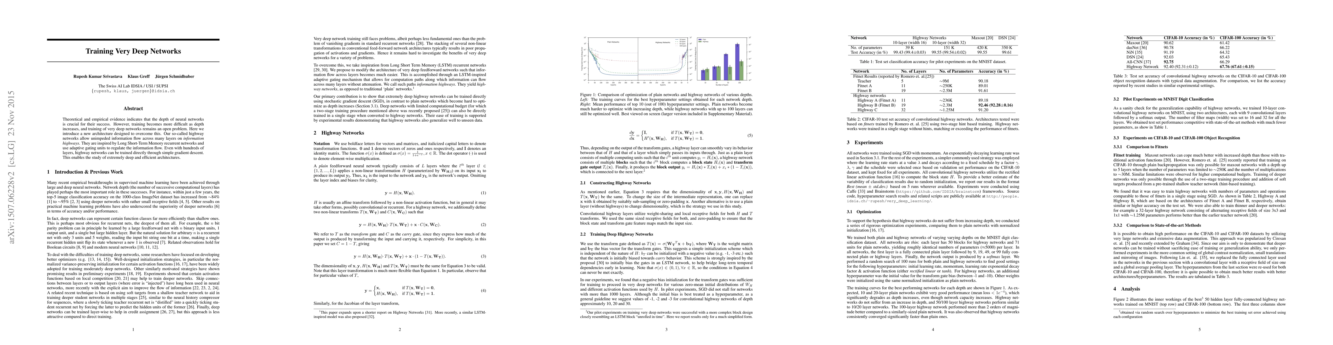 Researchers introduced a new neural network architecture called highway networks that can train extremely deep models using simple gradient descent, enabling the study of efficient architectures.
