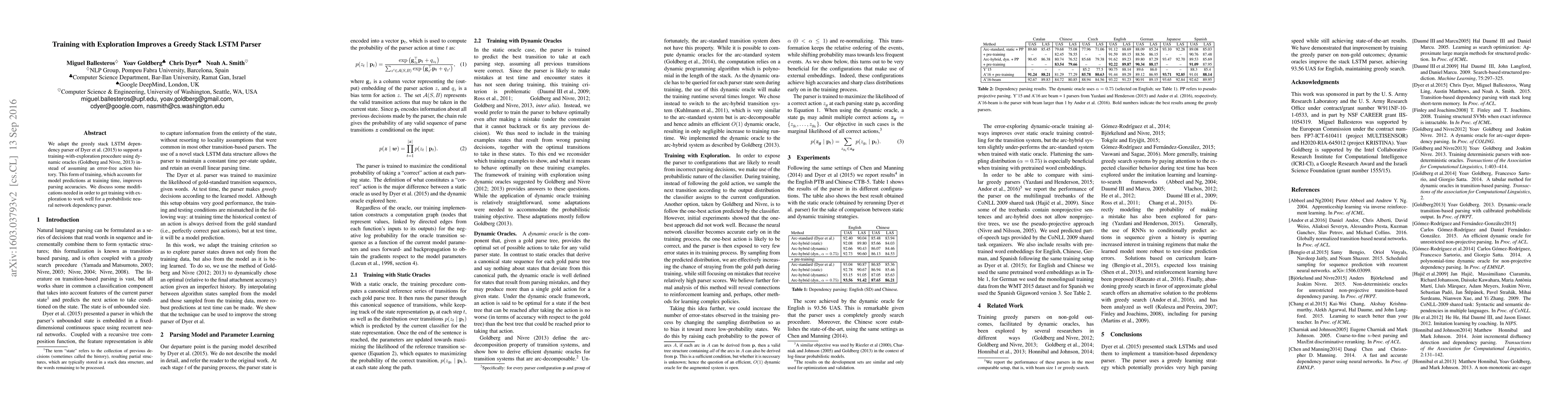 This paper adapts a greedy Stack-LSTM parser to use a training-with-exploration method, achieving improved parsing accuracy for both English and Chinese. The approach replaces traditional cross-entropy minimization with dynamic oracles, enhancing model performance by considering prediction errors during training.