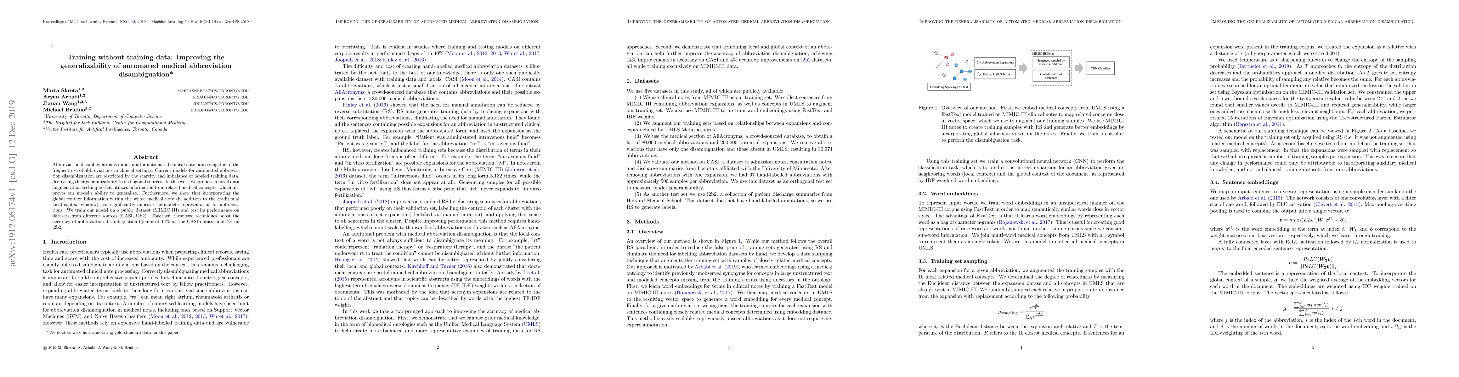 Abbreviation disambiguation is important for automated clinical note processing due to the frequent use of abbreviations in clinical settings. Current models for automated abbreviation disambiguation are restricted by the scarcity and imbalance of labeled training data, decreasing their generalizability to orthogonal sources. In this work we propose a novel data augmentation technique that utilizes information from related medical concepts, which improves our model's ability to generalize. Furthermore, we show that incorporating the global context information within the whole medical note (in addition to the traditional local context window), can significantly improve the model's representation for abbreviations. We train our model on a public dataset (MIMIC III) and test its performance on datasets from different sources (CASI, i2b2). Together, these two techniques boost the accuracy of abbreviation disambiguation by almost 14% on the CASI dataset and 4% on i2b2.