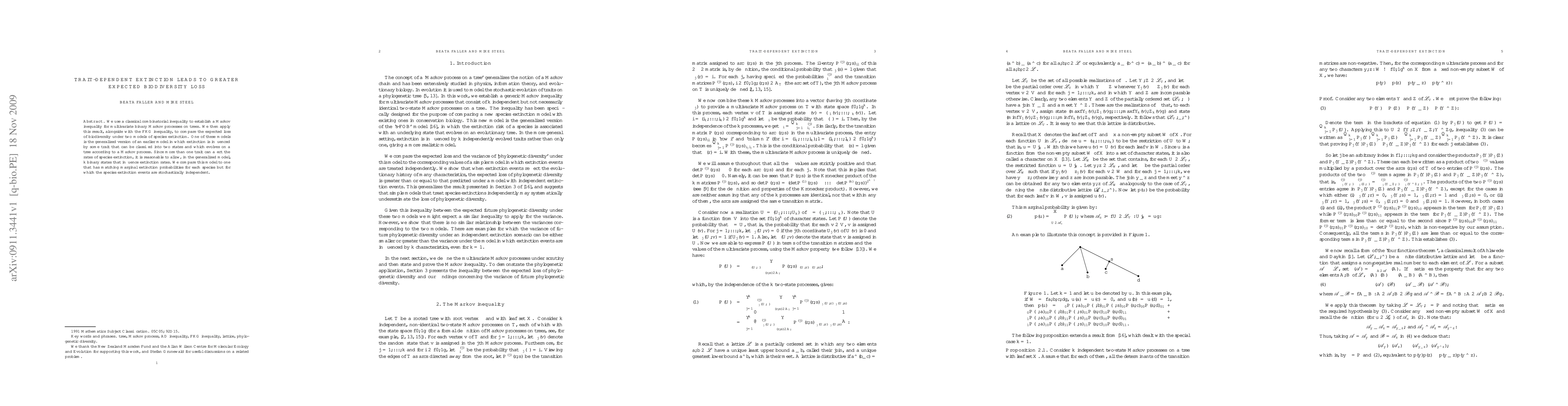 This paper establishes a Markov inequality for multivariate binary Markov processes on trees and applies it to compare biodiversity loss under two extinction models. The first model considers trait-dependent extinction influenced by multiple binary states, while the second assumes independent extinction events. The study finds that trait-dependent extinction leads to greater expected biodiversity loss.