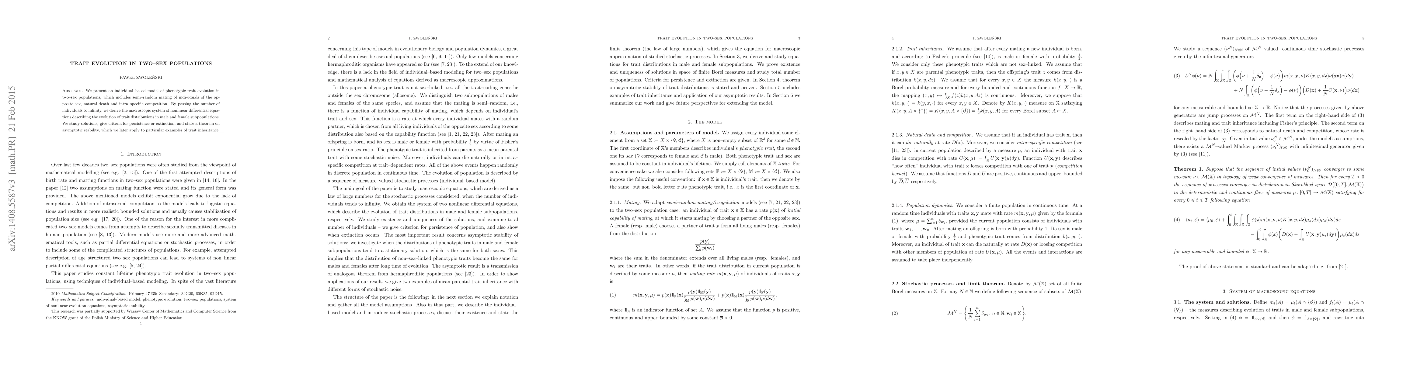 This paper develops an individual-based model for trait evolution in two-sex populations, deriving macroscopic differential equations and analyzing conditions for persistence, extinction, and asymptotic stability, with applications to specific inheritance scenarios.