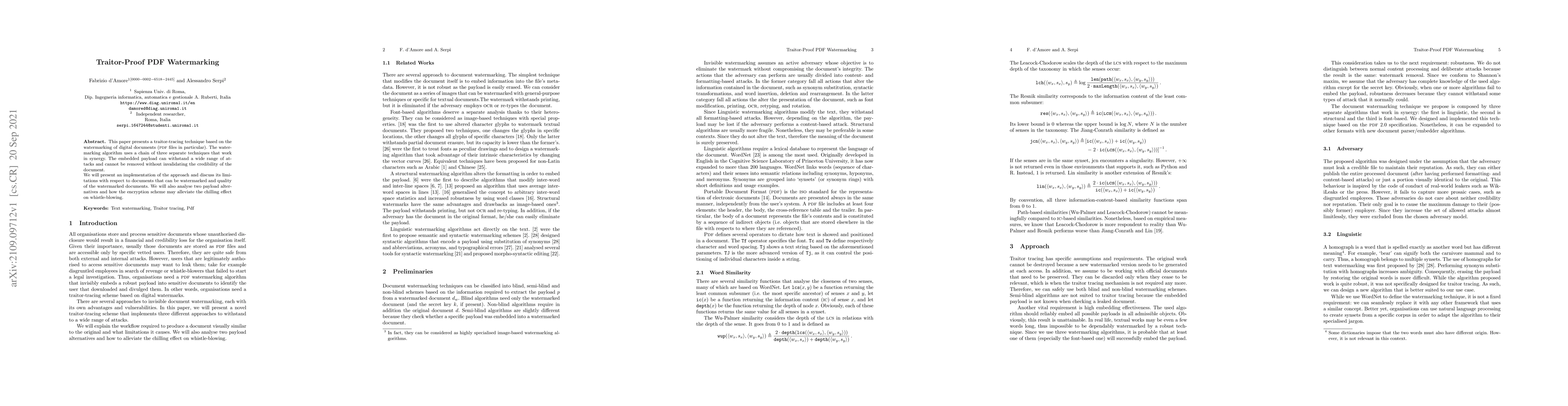 This paper introduces a robust traitor-tracing watermarking technique for PDF files, employing a synergistic chain of three methods to ensure the watermark's integrity and document credibility. The study also explores implementation, limitations, and alternative payloads, while considering the encryption scheme's impact on whistle-blowing.