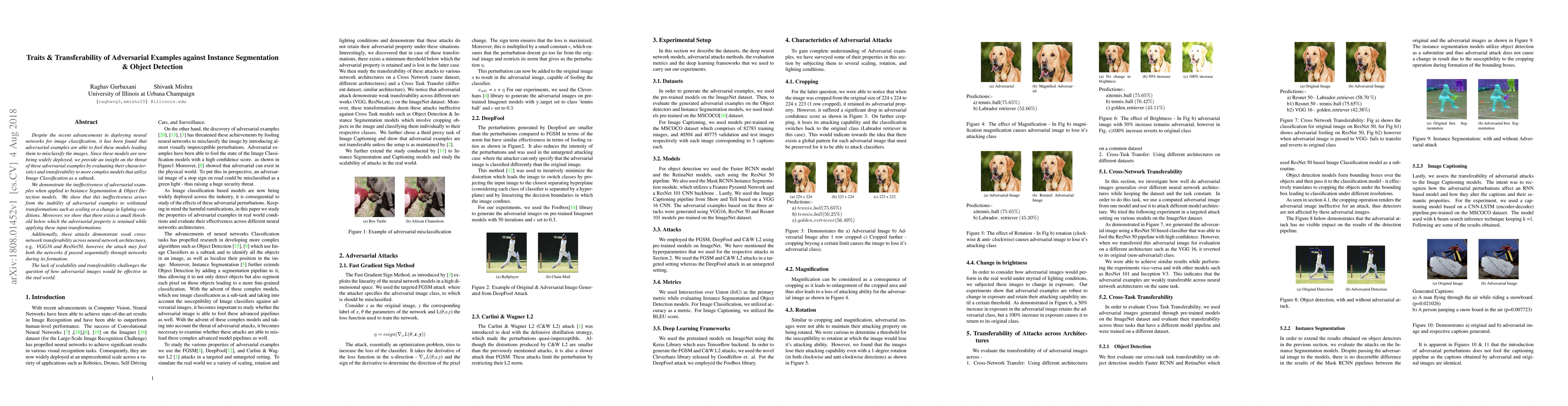 This paper investigates adversarial examples' characteristics and transferability, finding they struggle with transformations in Instance Segmentation & Object Detection models. It highlights their limited cross-network transferability and scalability, questioning their practical threat.