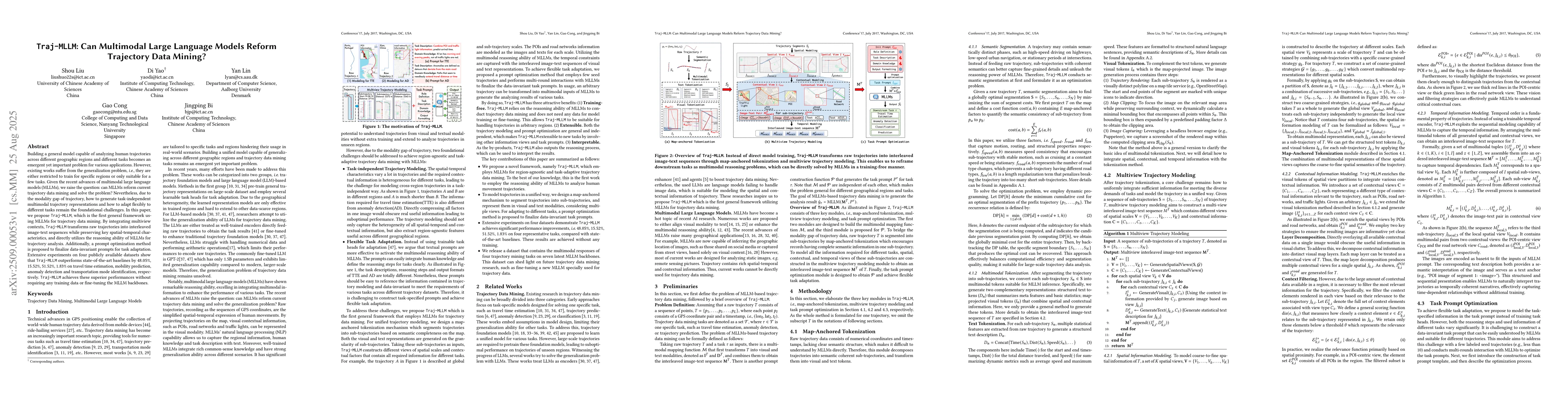 Building a general model capable of analyzing human trajectories across different geographic regions and different tasks becomes an emergent yet important problem for various applications. However, existing works suffer from the generalization problem, \ie, they are either restricted to train for specific regions or only suitable for a few tasks. Given the recent advances of multimodal large language models (MLLMs), we raise the question: can MLLMs reform current trajectory data mining and solve the problem? Nevertheless, due to the modality gap of trajectory, how to generate task-independent multimodal trajectory representations and how to adapt flexibly to different tasks remain the foundational challenges. In this paper, we propose \texttt{Traj-MLLM}}, which is the first general framework using MLLMs for trajectory data mining. By integrating multiview contexts, \texttt{Traj-MLLM}} transforms raw trajectories into interleaved image-text sequences while preserving key spatial-temporal characteristics, and directly utilizes the reasoning ability of MLLMs for trajectory analysis. Additionally, a prompt optimization method is proposed to finalize data-invariant prompts for task adaptation. Extensive experiments on four publicly available datasets show that \texttt{Traj-MLLM}} outperforms state-of-the-art baselines by $48.05\%$, $15.52\%$, $51.52\%$, $1.83\%$ on travel time estimation, mobility prediction, anomaly detection and transportation mode identification, respectively. \texttt{Traj-MLLM}} achieves these superior performances without requiring any training data or fine-tuning the MLLM backbones.