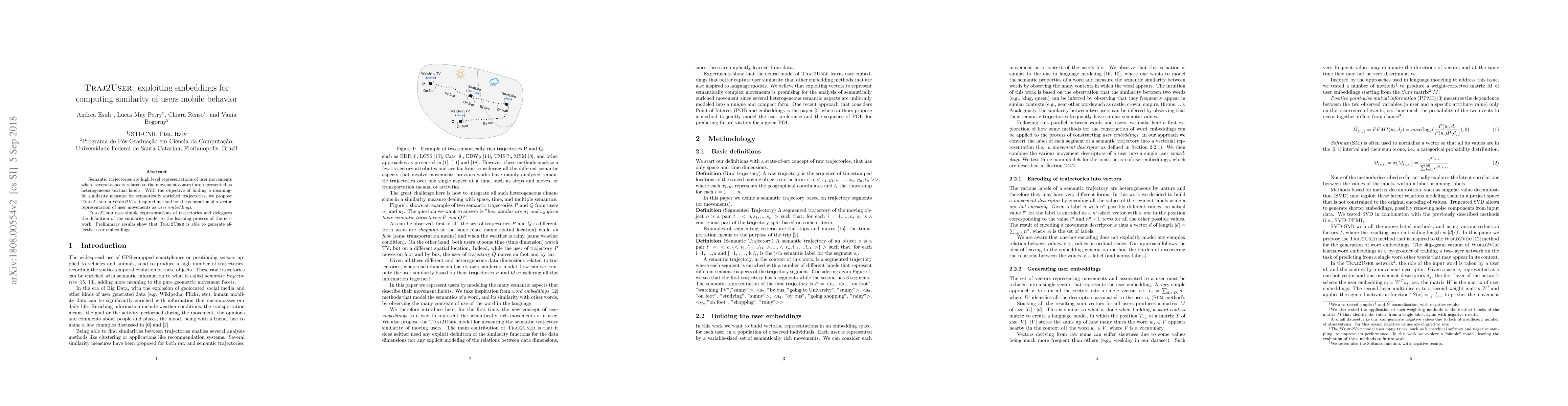 Summary: Traj2User proposes a Word2Vec-inspired method to generate vector representations of user movements from semantically enriched trajectories, enabling effective similarity measures. Preliminary results indicate its efficacy in creating meaningful user embeddings.