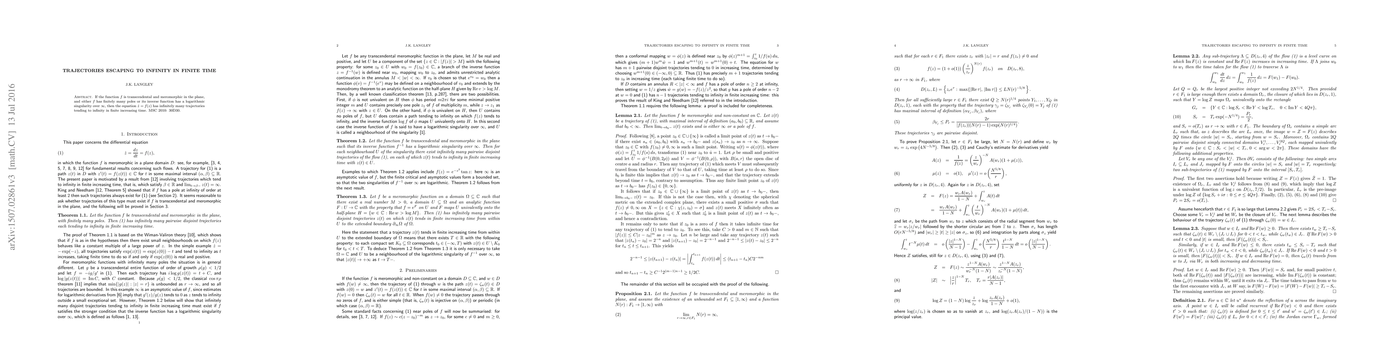 If the function $f$ is transcendental and meromorphic in the plane, and either $f$ has finitely many poles or its inverse function has a logarithmic singularity over infinity, then the equation $\dot z = f(z)$ has infinitely many trajectories tending to infinity in finite increasing time