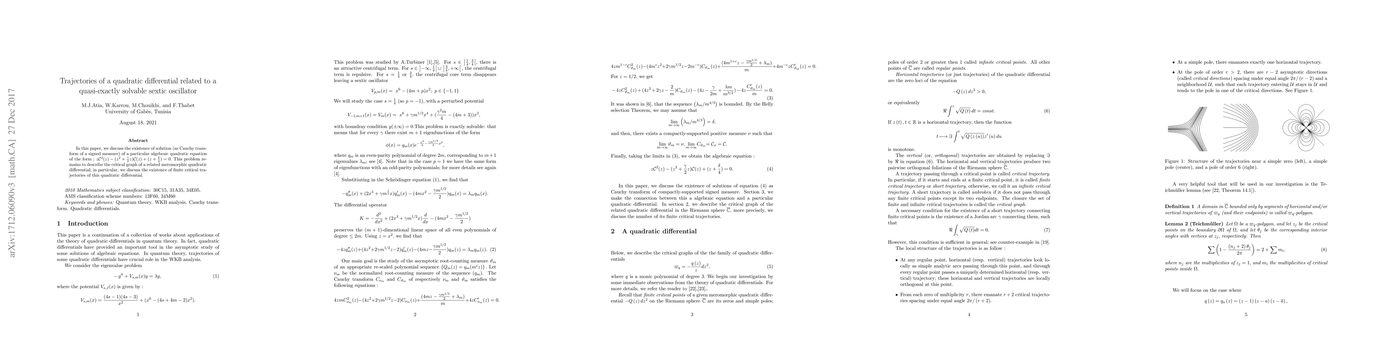 This paper investigates the solution of a quadratic differential equation associated with a quasi-exactly solvable sextic oscillator, focusing on the existence of finite critical trajectories of the related polynomial quadratic differential.