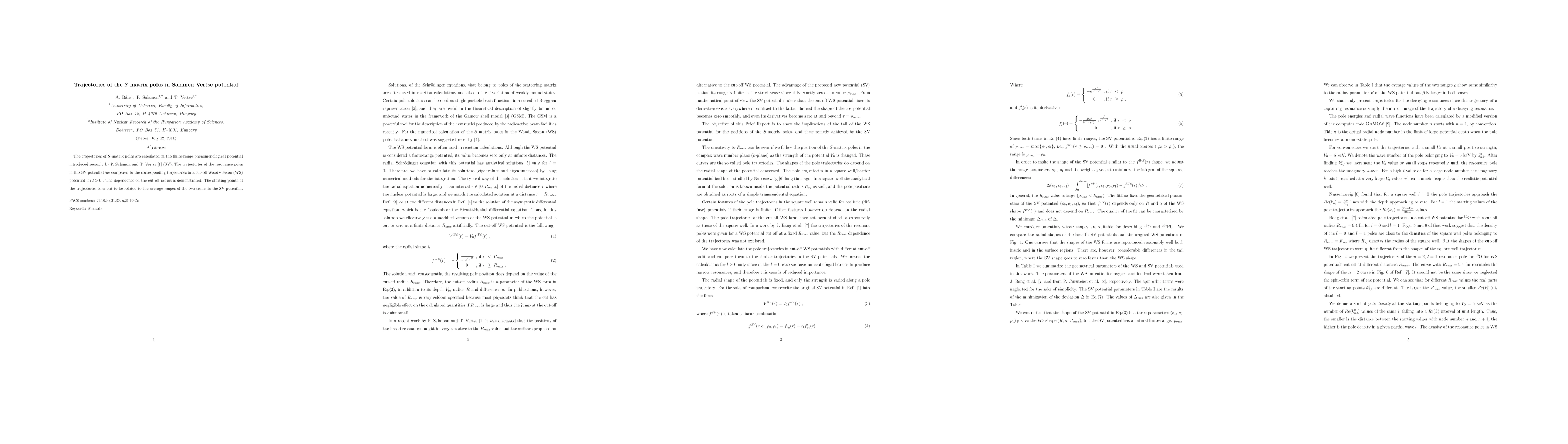 This paper calculates the trajectories of S-matrix poles in the Salamon-Vertse potential and compares them to those in a Woods-Saxon potential, demonstrating the dependence on the cut-off radius and linking the starting points to the average ranges of the SV potential's terms.