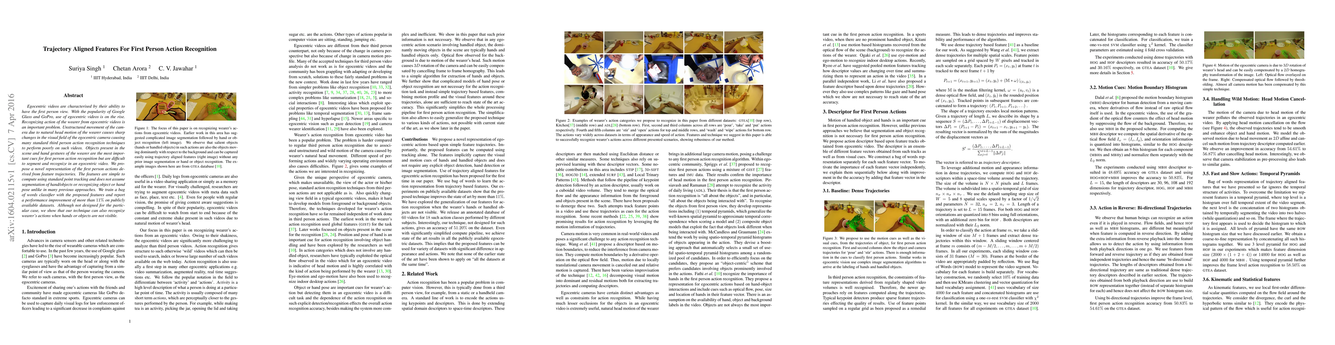 This paper proposes a novel method for first person action recognition in egocentric videos using trajectory aligned features, which are simple to compute without requiring segmentation or pose recognition. The method shows a performance improvement of over 11% on public datasets and can recognize actions even when hands or objects are not visible.