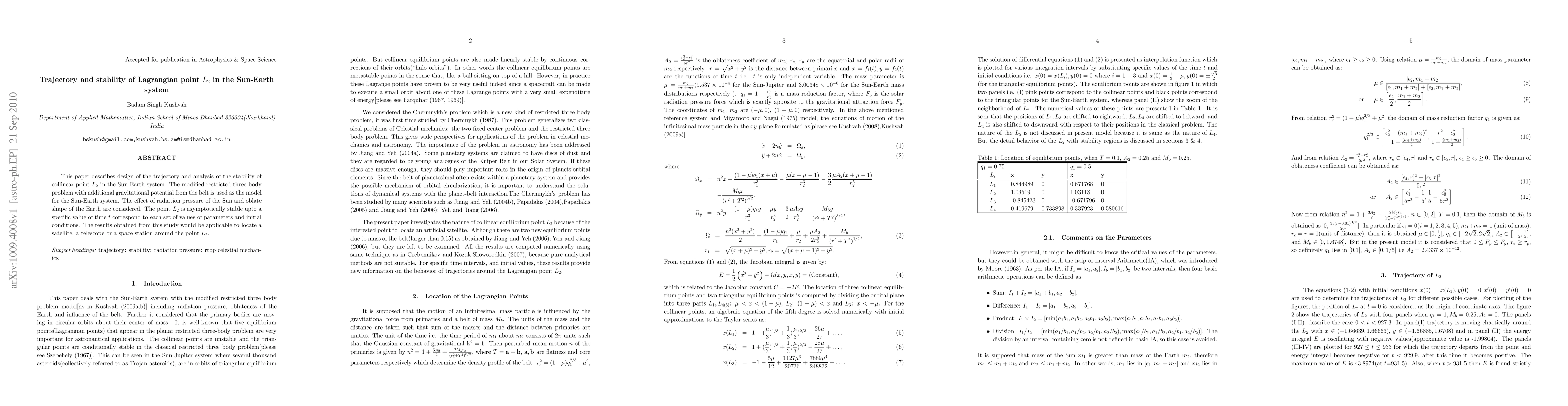 This paper investigates the trajectory and stability of the Sun-Earth system's $L_2$ Lagrangian point, using a modified restricted three-body model that includes gravitational potential from the belt, solar radiation pressure, and Earth's oblateness. The study finds $L_2$ to be asymptotically stable for specific parameter values and initial conditions.