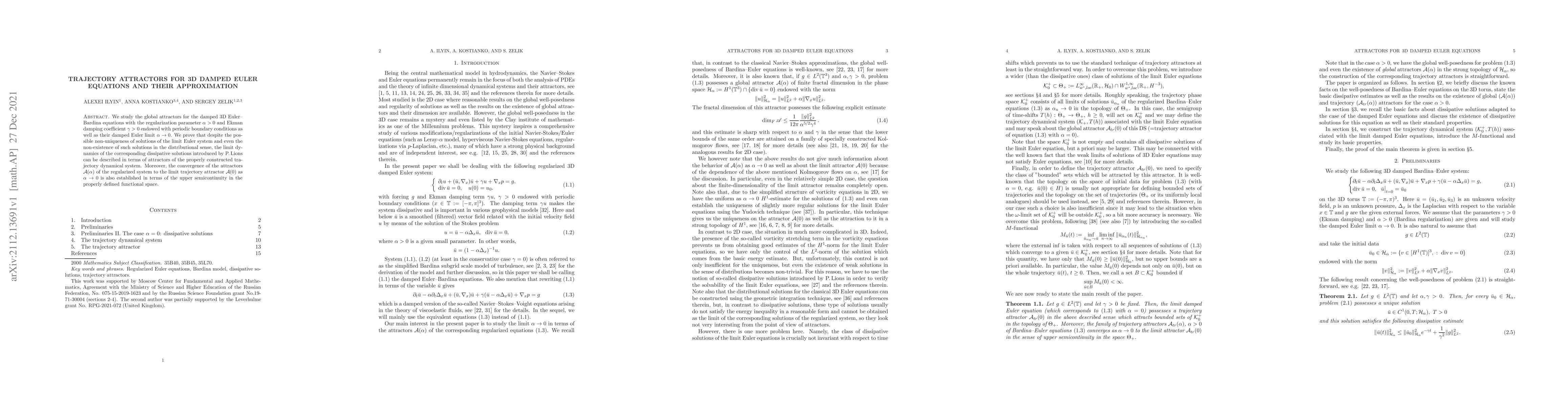 We study the global attractors for the damped 3D Euler--Bardina equations with the regularization parameter $\alpha>0$ and Ekman damping coefficient $\gamma>0$ endowed with periodic boundary conditions as well as their damped Euler limit $\alpha\to0$. We prove that despite the possible non-uniqueness of solutions of the limit Euler system and even the non-existence of such solutions in the distributional sense, the limit dynamics of the corresponding dissipative solutions introduced by P.\,Lions can be described in terms of attractors of the properly constructed trajectory dynamical system. Moreover, the convergence of the attractors $\Cal A(\alpha)$ of the regularized system to the limit trajectory attractor $\Cal A(0)$ as $\alpha\to0$ is also established in terms of the upper semicontinuity in the properly defined functional space.