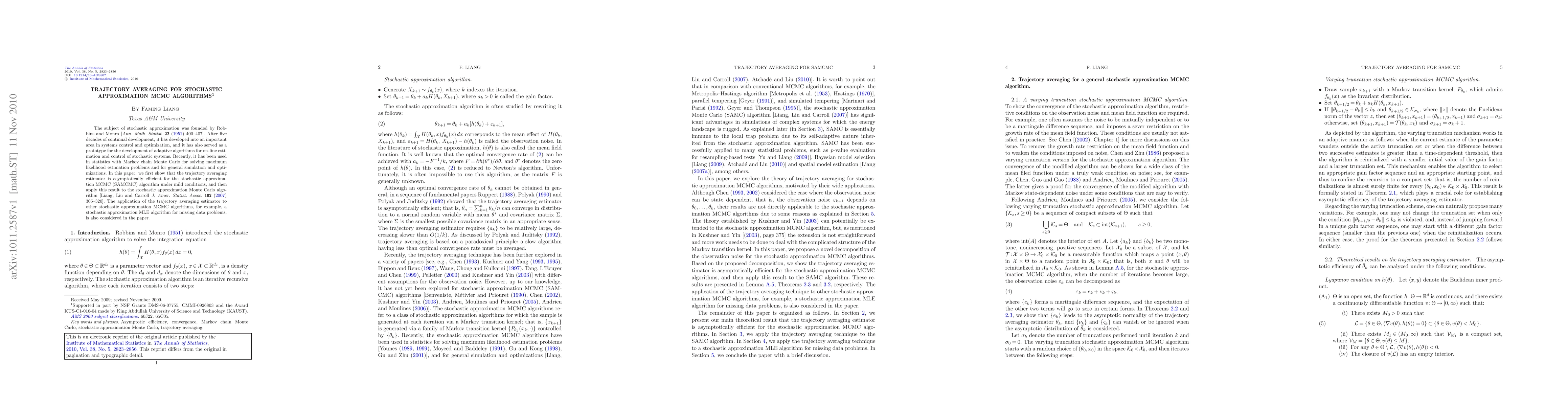 This paper demonstrates the asymptotic efficiency of trajectory averaging for stochastic approximation MCMC algorithms under mild conditions and applies this to the stochastic approximation Monte Carlo algorithm. It also explores the utility of trajectory averaging in other MCMC algorithms, such as those used for maximum likelihood estimation with missing data.