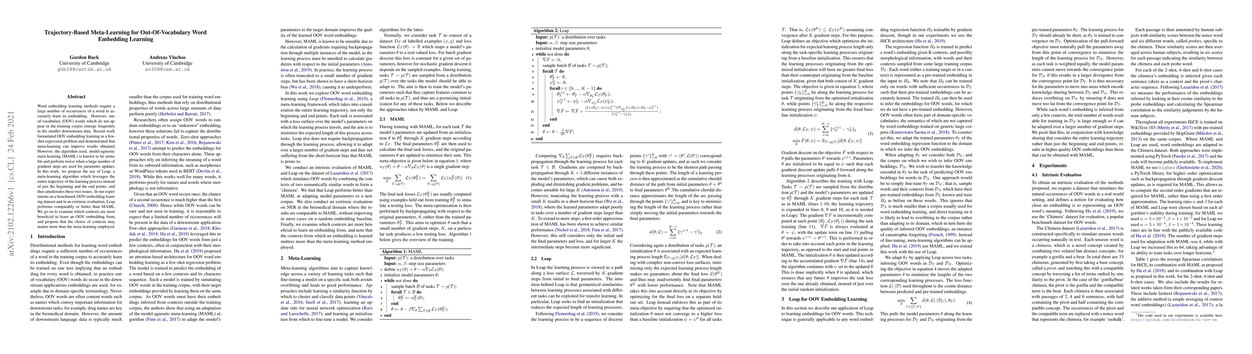 This paper proposes Leap, a trajectory-based meta-learning algorithm to improve out-of-vocabulary word embedding learning, addressing the instability of MAML. Experiments show Leap performs comparably or better than MAML, suggesting context choice may be more impactful than the meta-learning method used.