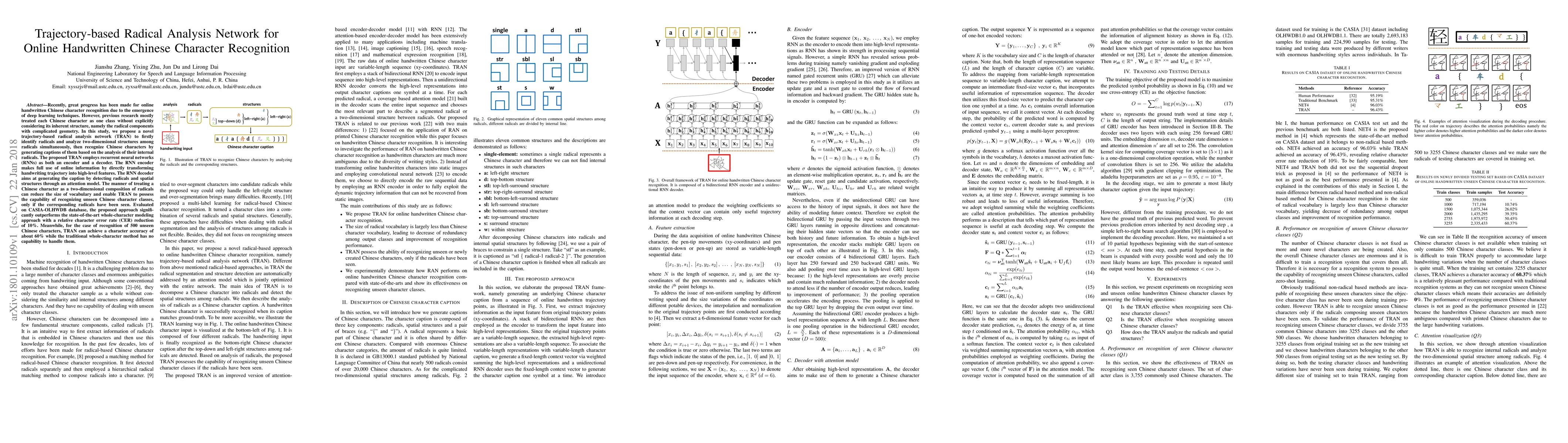 This paper proposes a trajectory-based radical analysis network (TRAN) for online handwritten Chinese character recognition, which identifies radicals and analyzes their structures to recognize characters. The TRAN employs RNNs for encoding trajectories and decoding through an attention model, significantly outperforming traditional methods and enabling recognition of unseen characters.