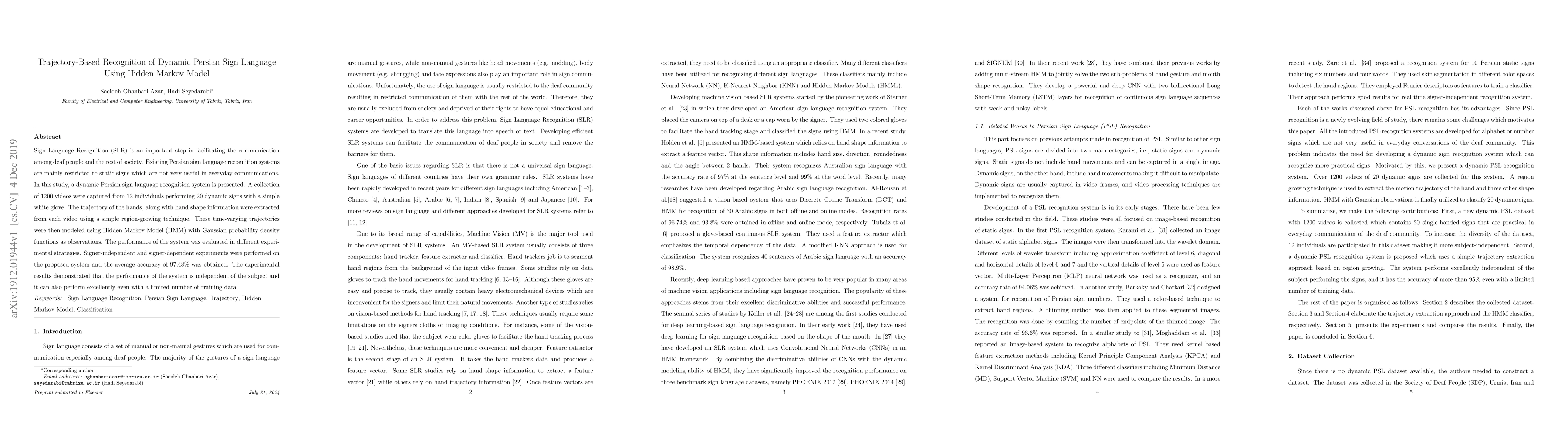 Sign Language Recognition (SLR) is an important step in facilitating the communication among deaf people and the rest of society. Existing Persian sign language recognition systems are mainly restricted to static signs which are not very useful in everyday communications. In this study, a dynamic Persian sign language recognition system is presented. A collection of 1200 videos were captured from 12 individuals performing 20 dynamic signs with a simple white glove. The trajectory of the hands, along with hand shape information were extracted from each video using a simple region-growing technique. These time-varying trajectories were then modeled using Hidden Markov Model (HMM) with Gaussian probability density functions as observations. The performance of the system was evaluated in different experimental strategies. Signer-independent and signer-dependent experiments were performed on the proposed system and the average accuracy of 97.48% was obtained. The experimental results demonstrated that the performance of the system is independent of the subject and it can also perform excellently even with a limited number of training data.