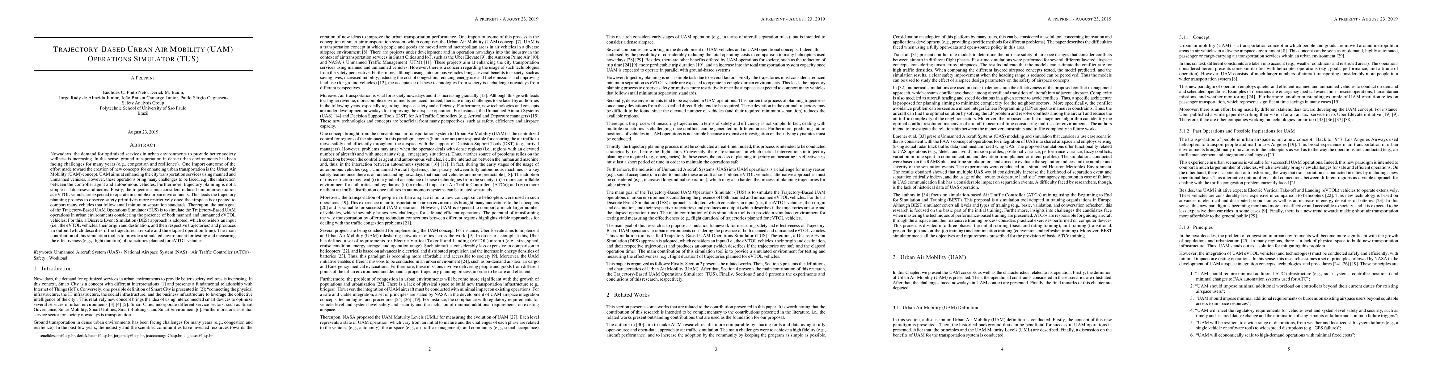 The paper introduces a Trajectory-Based Urban Air Mobility (UAM) Operations Simulator (TUS) designed to simulate UAM operations in urban environments using both manned and unmanned eVTOL vehicles. The tool employs a Discrete Event Simulation approach to evaluate the safety and efficiency of planned trajectories, aiming to enhance urban transportation services.