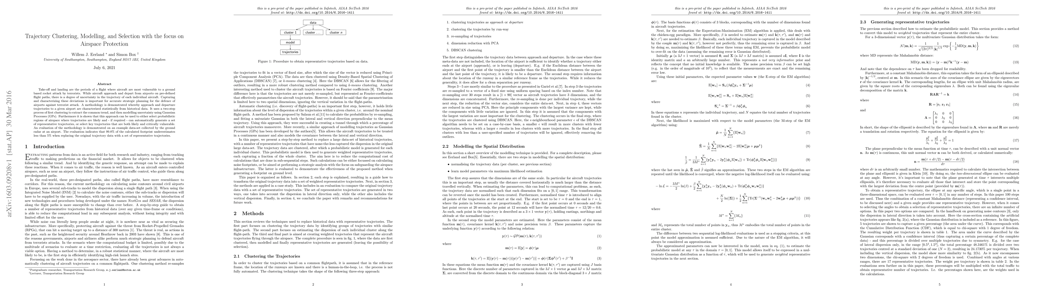 Take-off and landing are the periods of a flight where aircraft are most vulnerable to a ground based rocket attack by terrorists. While aircraft approach and depart from airports on pre-defined flight paths, there is a degree of uncertainty in the trajectory of each individual aircraft. Capturing and characterizing these deviations is important for accurate strategic planning for the defence of airports against terrorist attack. A methodology is demonstrated whereby approach and departure trajectories to a given airport are characterized statistically from historical data. It uses a two-step process of first clustering to extract the common trend, and then modelling uncertainty using Gaussian Processes (GPs). Furthermore it is shown that this approach can be used to either select probabilistic regions of airspace where trajectories are likely and - if required - can automatically generate a set of representative trajectories, or select key trajectories that are both likely and critically vulnerable. An evaluation of the methodology is demonstrated on an example data-set collected by the ground radar at an airport. The evaluation indicates that 99.8% of the calculated footprint underestimates less than 5% when replacing the original trajectory data with a set of representative trajectories.