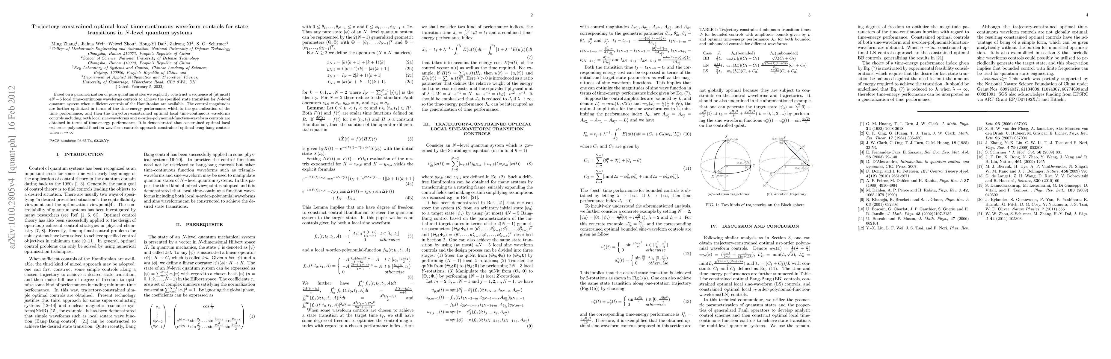Based on a parametrization of pure quantum states we explicitly construct a sequence of (at most) $4N-5$ local time-continuous waveform controls to achieve a specified state transition for $N$-level quantum systems when sufficient controls of the Hamiltonian are available. The control magnitudes are further optimized in terms of a time-energy performance, which is a generalization of the time performance index. Trajectory-constrained optimal local time-continuous waveform controls, including both local sine-waveforms and $n^{\rm th}$-order-polynomial waveform controls are obtained in terms of time-energy performance. It is demonstrated that constrained optimal local $n^{\rm th}$-order-polynomial waveform controls approach constrained optimal bang-bang controls when $n\rightarrow\infty$.