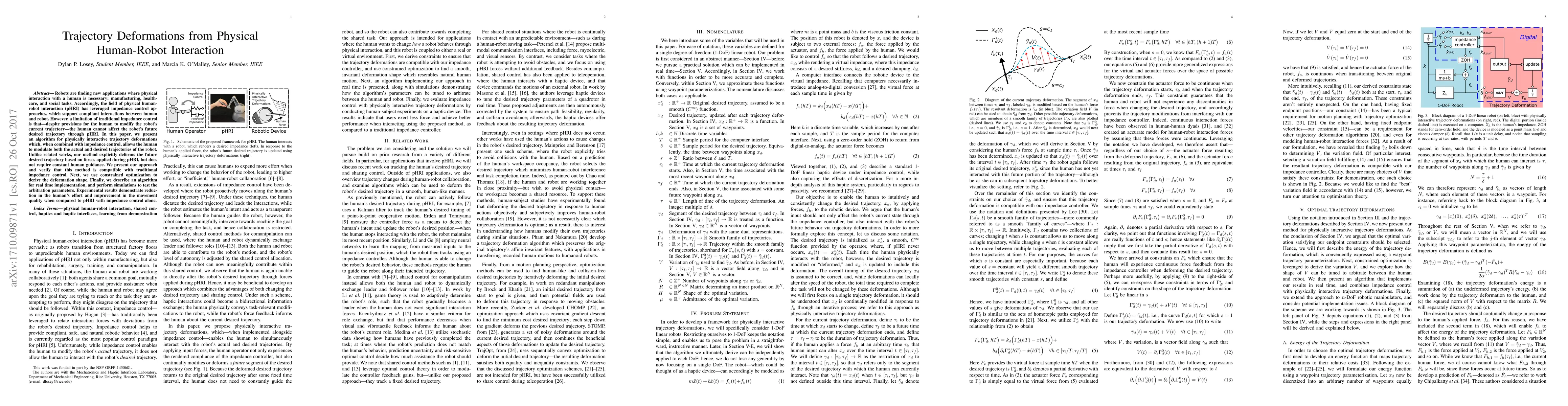 Robots are finding new applications where physical interaction with a human is necessary: manufacturing, healthcare, and social tasks. Accordingly, the field of physical human-robot interaction (pHRI) has leveraged impedance control approaches, which support compliant interactions between human and robot. However, a limitation of traditional impedance control is that---despite provisions for the human to modify the robot's current trajectory---the human cannot affect the robot's future desired trajectory through pHRI. In this paper, we present an algorithm for physically interactive trajectory deformations which, when combined with impedance control, allows the human to modulate both the actual and desired trajectories of the robot. Unlike related works, our method explicitly deforms the future desired trajectory based on forces applied during pHRI, but does not require constant human guidance. We present our approach and verify that this method is compatible with traditional impedance control. Next, we use constrained optimization to derive the deformation shape. Finally, we describe an algorithm for real time implementation, and perform simulations to test the arbitration parameters. Experimental results demonstrate reduction in the human's effort and improvement in the movement quality when compared to pHRI with impedance control alone.
