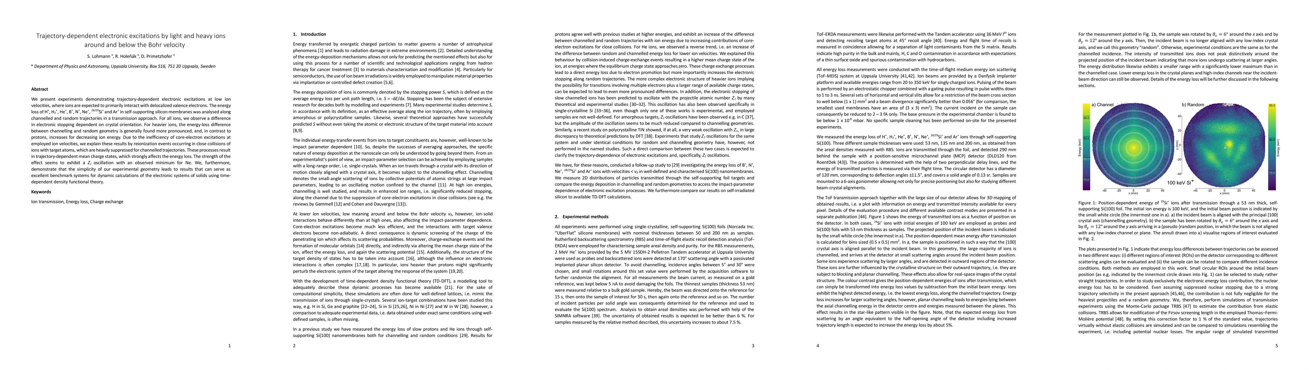 We present experiments demonstrating trajectory-dependent electronic excitations at low ion velocities, where ions are expected to primarily interact with delocalized valence electrons. The energy loss of H$^+$, H$_2 ^+$, He$^+$, B$^+$, N$^+$, Ne$^+$, $^{28/29}$Si$^+$ and Ar$^+$ in self-supporting silicon membranes was analysed along channelled and random trajectories in a transmission approach. For all ions, we observe a difference in electronic stopping dependent on crystal orientation. For heavier ions, the energy-loss difference between channelling and random geometry is generally found more pronounced, and, in contrast to protons, increases for decreasing ion energy. Due to the inefficiency of core-electron excitations at employed ion velocities, we explain these results by reionization events occurring in close collisions of ions with target atoms, which are heavily suppressed for channelled trajectories. These processes result in trajectory-dependent mean charge states, which strongly affects the energy loss. The strength of the effect seems to exhibit a Z$_1$ oscillation with an observed minimum for Ne. We, furthermore, demonstrate that the simplicity of our experimental geometry leads to results that can serve as excellent benchmark systems for dynamic calculations of the electronic systems of solids using time-dependent density functional theory.