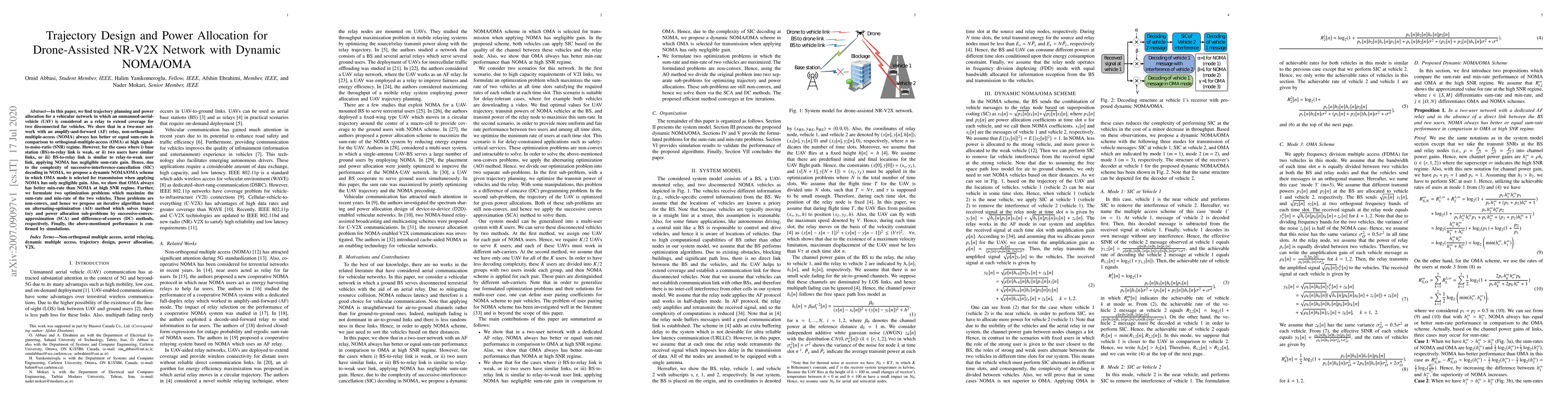 This paper proposes a dynamic NOMA/OMA scheme for a drone-assisted NR-V2X network, showing that NOMA outperforms OMA in high SNR regimes but OMA ensures better min-rate. An iterative algorithm based on alternating-optimization and successive-convex-approximation methods is developed to optimize trajectory and power allocation, confirmed effective via simulations.