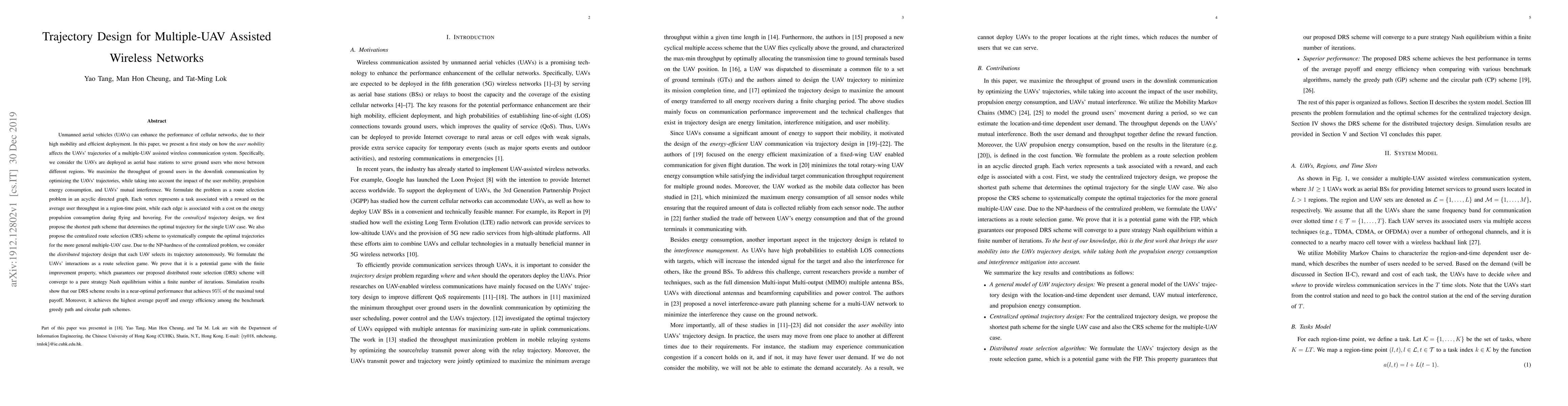 This paper investigates optimizing UAV trajectories in multiple-UAV assisted wireless networks to maximize ground user throughput while considering user mobility, energy consumption, and interference. It proposes centralized and distributed route selection schemes for trajectory design, with the latter achieving a Nash equilibrium.