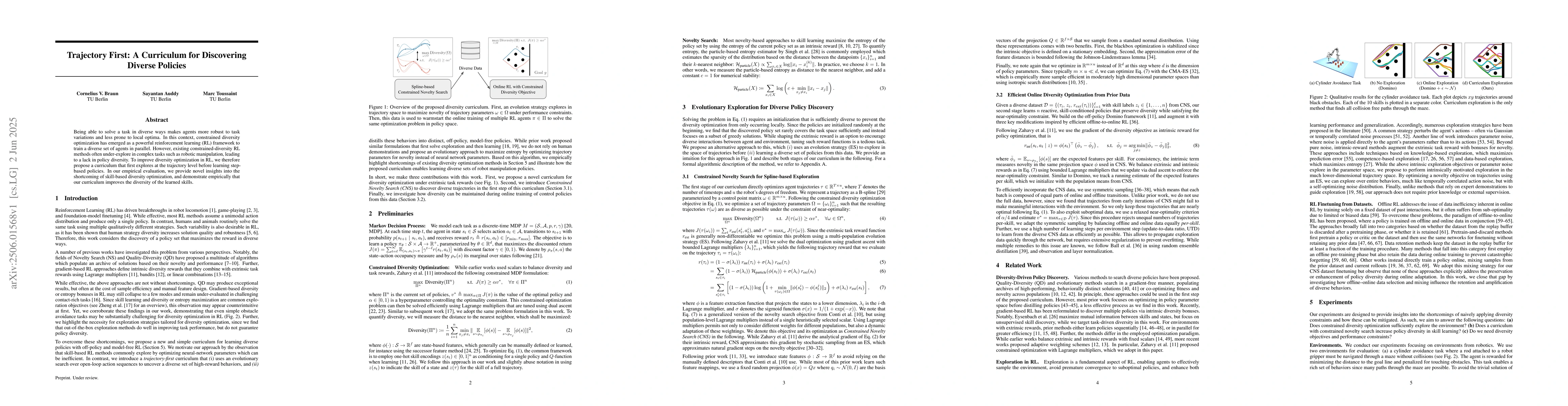 The research proposes a curriculum for reinforcement learning (RL) that first explores at the trajectory level before learning step-based policies to improve diversity optimization, particularly in complex tasks like robotic manipulation.