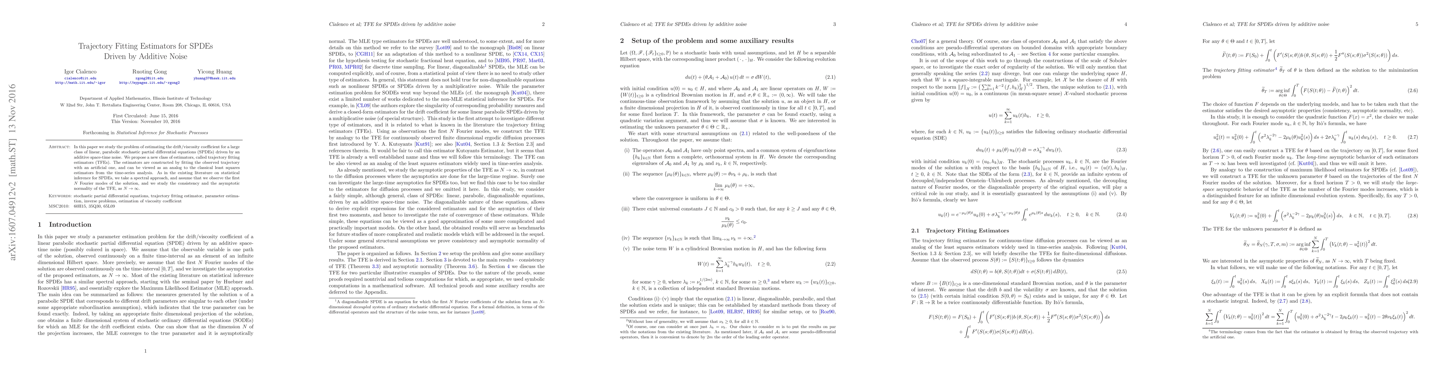 This paper introduces trajectory fitting estimators (TFEs) for estimating the drift/viscosity coefficient in linear, parabolic SPDEs driven by additive noise. The TFEs fit observed trajectories to artificial ones, analogous to least squares estimators, and are analyzed for consistency and asymptotic normality as the number of observed Fourier modes increases.