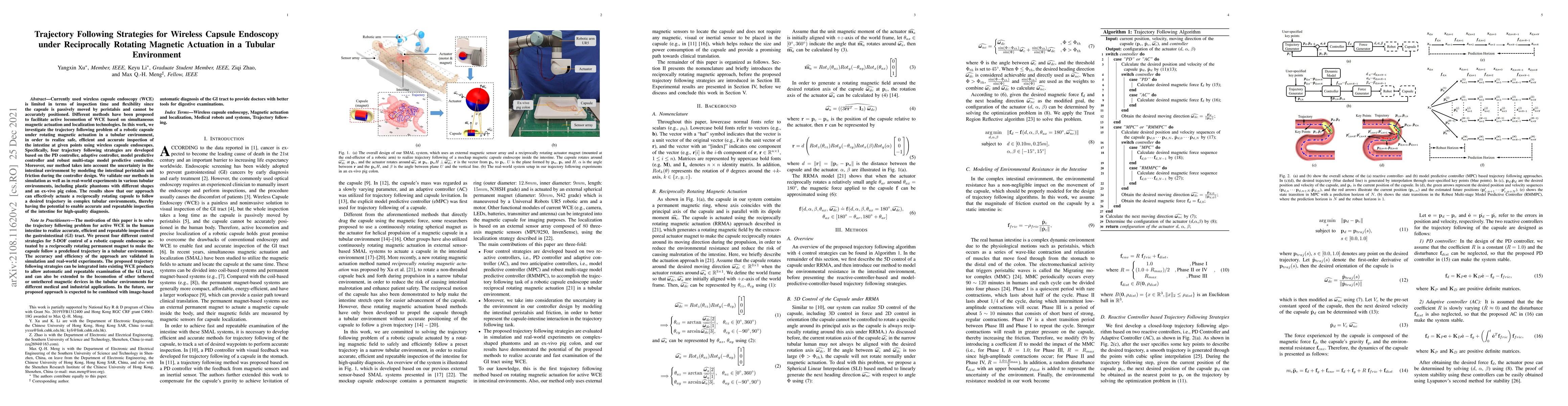 Currently used wireless capsule endoscopy (WCE) is limited in terms of inspection time and flexibility since the capsule is passively moved by peristalsis and cannot be accurately positioned. Different methods have been proposed to facilitate active locomotion of WCE based on simultaneous magnetic actuation and localization technologies. In this work, we investigate the trajectory following problem of a robotic capsule under rotating magnetic actuation in a tubular environment, in order to realize safe, efficient and accurate inspection of the intestine at given points using wireless capsule endoscopes. Specifically, four trajectory following strategies are developed based on the PD controller, adaptive controller, model predictive controller and robust multi-stage model predictive controller. Moreover, our method takes into account the uncertainty in the intestinal environment by modeling the intestinal peristalsis and friction during the controller design. We validate our methods in simulation as well as in real-world experiments in various tubular environments, including plastic phantoms with different shapes and an ex-vivo pig colon. The results show that our approach can effectively actuate a reciprocally rotating capsule to follow a desired trajectory in complex tubular environments, thereby having the potential to enable accurate and repeatable inspection of the intestine for high-quality diagnosis.
