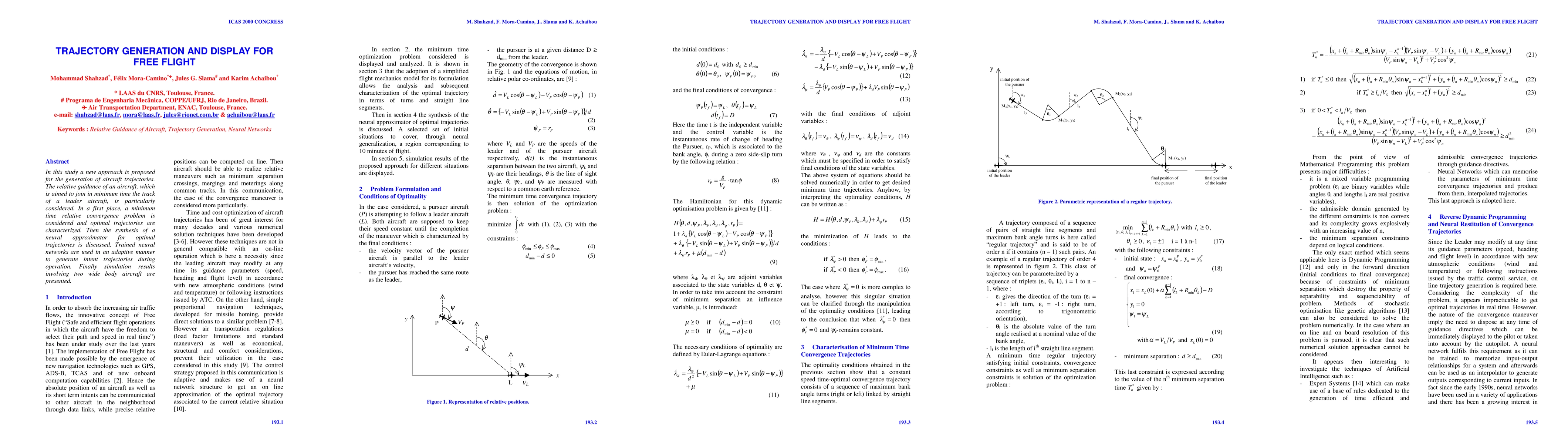 In this study a new approach is proposed for the generation of aircraft trajectories. The relative guidance of an aircraft, which is aimed to join in minimum time the track of a leader aircraft, is particularly considered. In a first place, a minimum time relative convergence problem is considered and optimal trajectories are characterized. Then the synthesis of a neural approximator for optimal trajectories is discussed. Trained neural networks are used in an adaptive manner to generate intent trajectories during operation. Finally simulation results involving two wide body aircraft are presented.