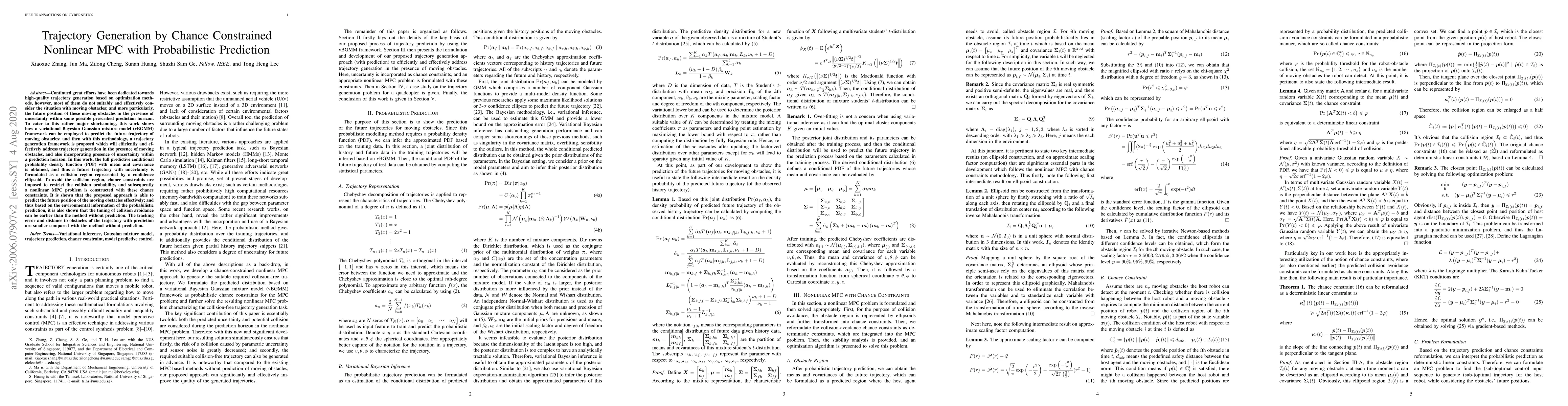 The paper presents a novel trajectory generation framework using chance-constrained nonlinear MPC with probabilistic prediction, effectively addressing collision avoidance in uncertain environments.