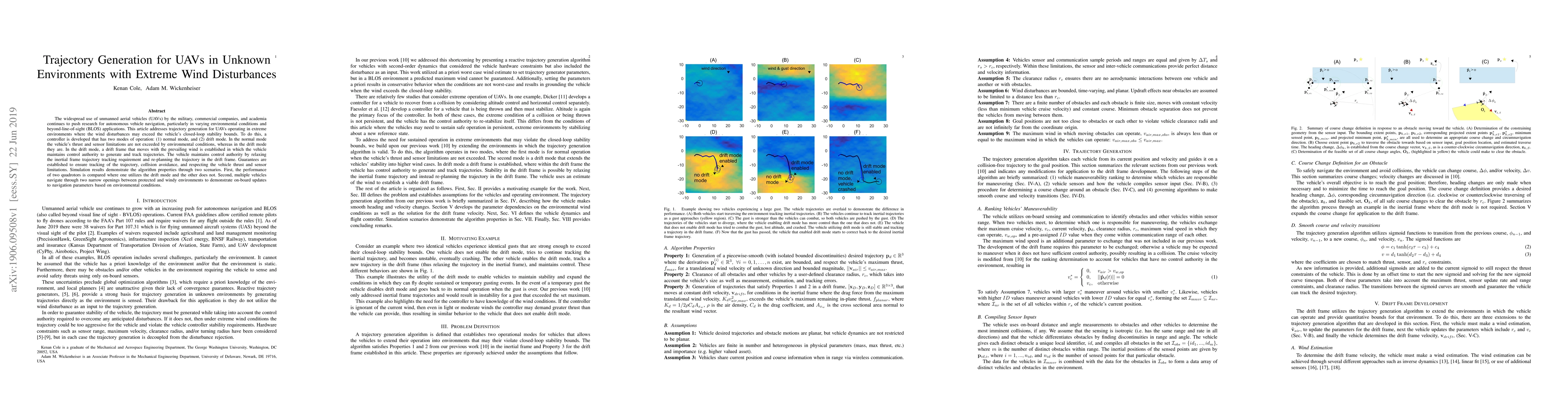 The widespread use of unmanned aerial vehicles (UAVs) by the military, commercial companies, and academia continues to push research for autonomous vehicle navigation, particularly in varying environmental conditions and beyond-line-of-sight (BLOS) applications. This article addresses trajectory generation for UAVs operating in extreme environments where the wind disturbances may exceed the vehicle's closed-loop stability bounds. To do this, a controller is developed that has two modes of operation: (1) normal mode, and (2) drift mode. In the normal mode the vehicle's thrust and sensor limitations are not exceeded by environmental conditions, whereas in the drift mode they are. In the drift mode, a drift frame that moves with the prevailing wind is established in which the vehicle maintains control authority to generate and track trajectories. The vehicle maintains control authority by relaxing the inertial frame trajectory tracking requirement and re-planning the trajectory in the drift frame. Guarantees are established to ensure tracking of the trajectory, collision avoidance, and respecting the vehicle thrust and sensor limitations. Simulation results demonstrate the algorithm properties through two scenarios. First, the performance of two quadrotors is compared where one utilizes the drift mode and the other does not. Second, multiple vehicles navigate through two narrow openings between protected and windy environments to demonstrate on-board updates to navigation parameters based on environmental conditions.