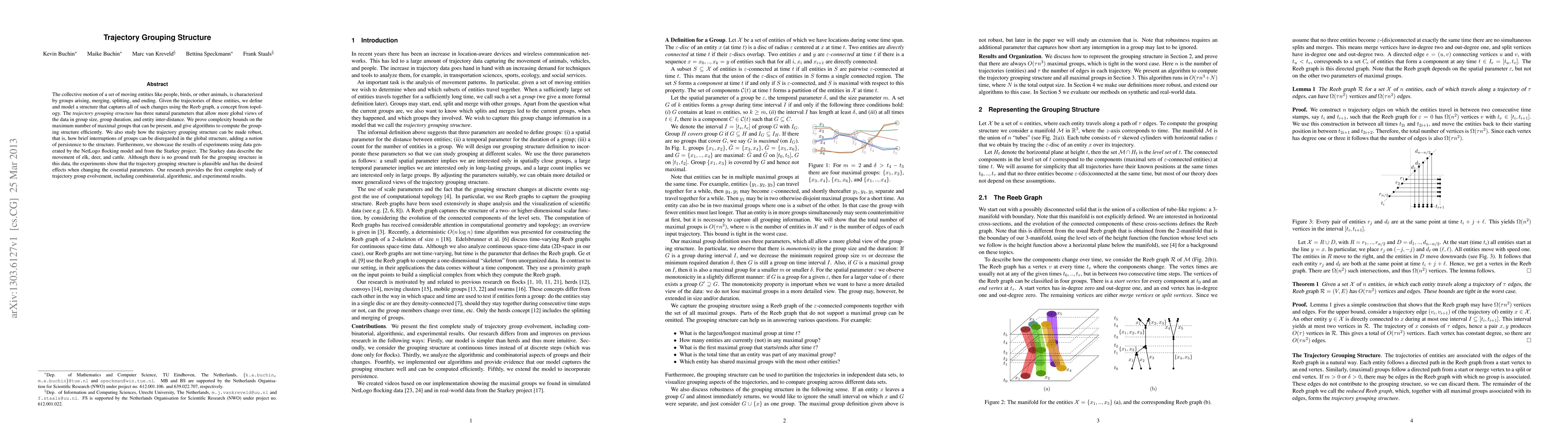 Researchers develop a structure to model collective motion of entities like people or animals, capturing group formation, splitting, and persistence using the Reeb graph; they also demonstrate its robustness against brief interruptions.