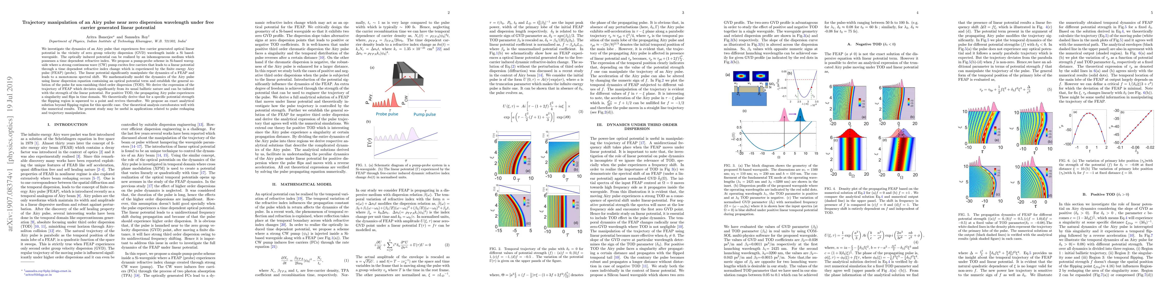 We investigate the dynamics of an Airy pulse that experiences free carrier generated optical linear potential in the vicinity of zero group velocity dispersion (GVD) wavelength inside a Si based waveguide. The optically induced potential can be realized by an inhomogeneous medium which possesses a time dependent refractive index. We propose a pump-probe scheme in Si-based waveguide where a strong continuous wave (CW) pump excites free carriers that leads to a linear potential through a time dependent refractive index change which is experienced by the finite energy Airy pulse (FEAP) (probe). The linear potential significantly manipulate the dynamics of a FEAP and leads to a monotonous spectral shift. We mathematically model the dynamics of the Airy pulse using linear dispersion equation containing an optical potential term and establish the general solution of the pulse for non-vanishing third order dispersion (TOD). We derive the expression of the trajectory of FEAP which deviates significantly from its usual ballistic nature and can be tailored with the strength of the linear potential. For positive TOD, the propagating Airy pulse experiences a singularity and flips in time domain. We theoretically derive that for a specific potential strength the flipping region is squeezed to a point and revives thereafter. We propose an exact analytical solution beyond flipping region for this specific case. Our theoretical analysis corroborates well with the numerical results. The present study may be useful in applications related to pulse reshaping and trajectory manipulation