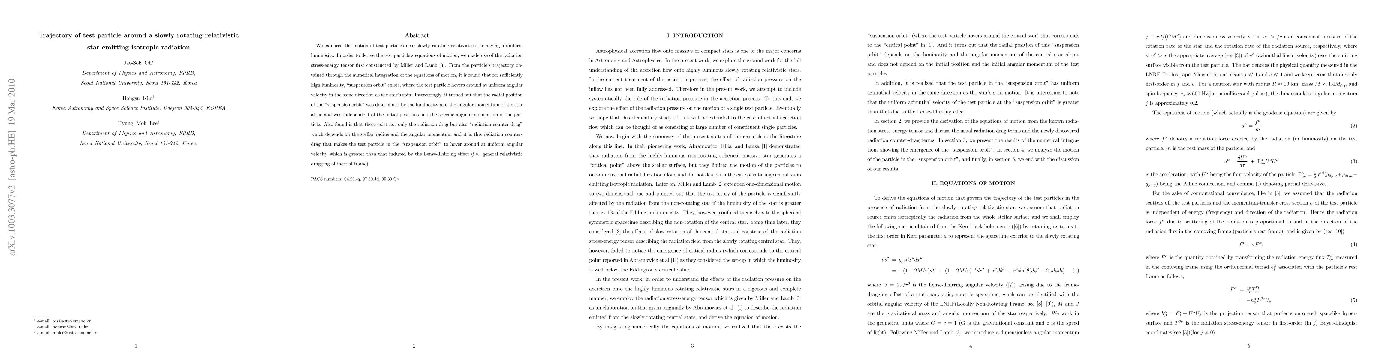 This paper investigates the motion of test particles around a slowly rotating relativistic star emitting isotropic radiation, revealing the existence of a "suspension orbit" where particles hover at uniform angular velocity, driven by a radiation counter-drag independent of initial particle conditions.